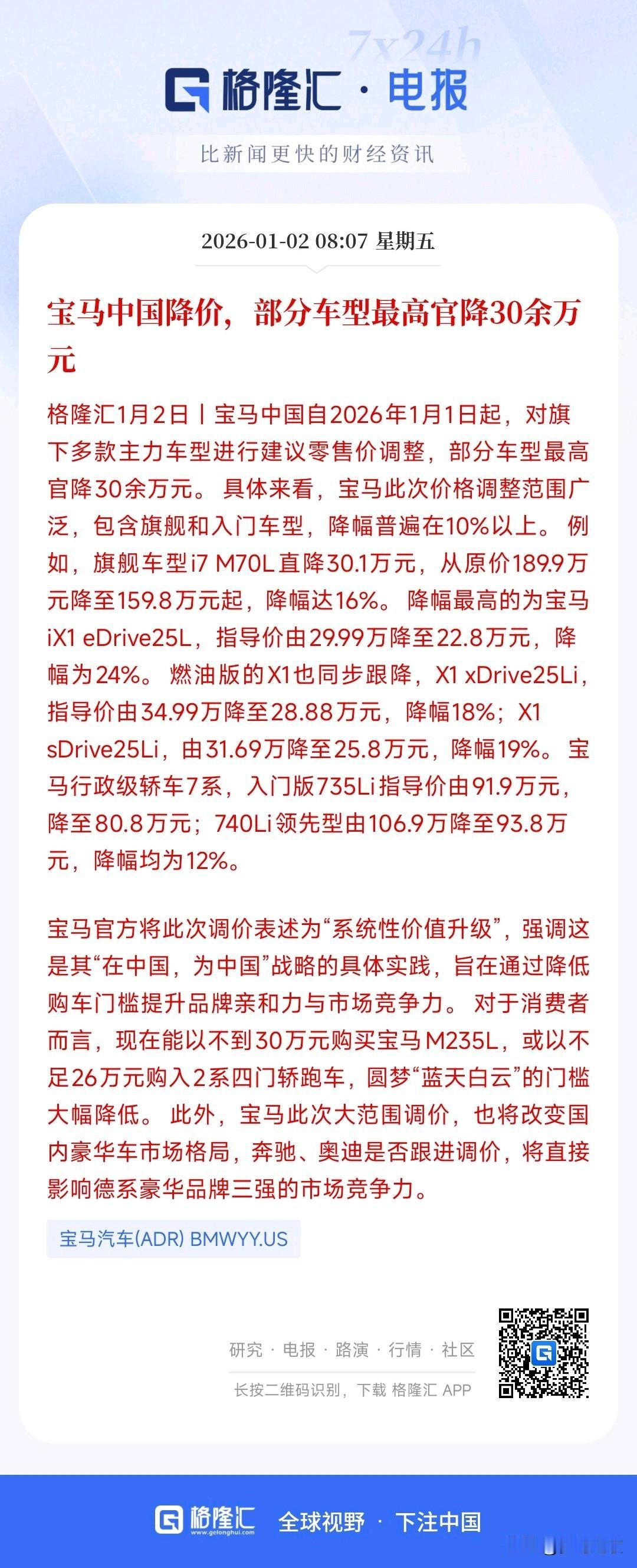 刚刚过完元旦,汽车价格战再次打起来了,不过这次是外资车企降价的多 元旦刚刚过完,起亚和宝马,以及一汽就开始汽车大甩卖了 宝马: iX1 eDrive25L:降7.19万元(24%降幅); X1 sDrive25Li:降5.89万元至25.8万元;735Li:降11.1万元至80.8万元 起亚最狠: K3:一口价6.99万元,较原指导价11.44万元直降4.45万元 一汽丰田: bZ3智享家版:指导价10.98-15.98万元,相比老款起售价直降6万元。低配版降7.6万 ​ 这次外资车企发起的价格战明显就是进一步攻占中国市场,不知道这次中国车企如何应对。