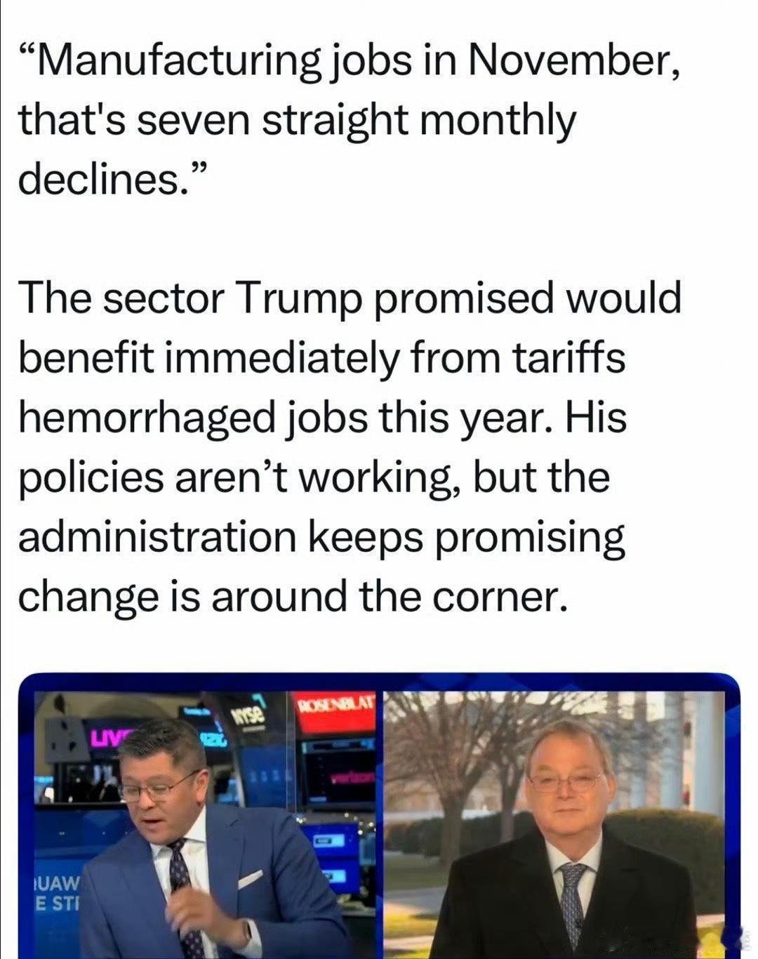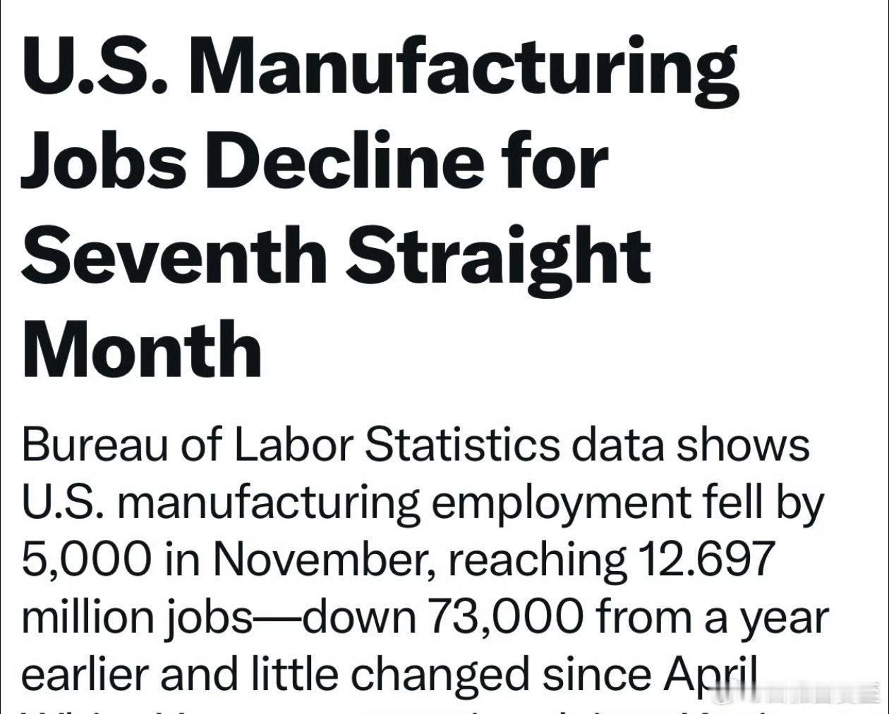 美国十一月制造业岗位减少五千,已连续第七个月下降 制造业总就业人数:1269.7万,比一年前少7.3万 比四月没有改善,加征“全球对等关税”对“振兴制造业”没有帮助