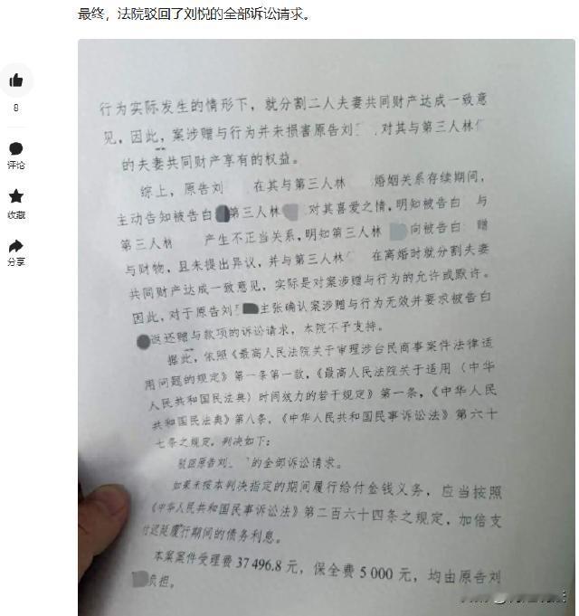 重庆,女子刘悦离婚后查账时发现前夫在婚姻存续期间给妻子的表妹兼情人白萍转了380多万,刘悦起诉要求返还,一审法院却以“知情默许”为由驳回全部诉求。争议:容忍婚外情是否等于同意财产赠与。 大道新闻2025年12月31日报道:这事还得从二十多年前说起,那时候,林森和刘悦结婚后,林森却背着刘悦,和她的表妹白萍搞到了一起,还生了个女儿。 刘悦知道后。为了家庭,为了孩子,她最终选择了原谅林森,希望他能改过自新。 可林森表面上答应了结束婚外情,背地里却还是和白萍藕断丝连。这事刘悦虽然心里有数,但为了家庭和谐,也只能睁一只眼闭一只眼。 直到2022年,两人实在过不下去了,离了婚。 离婚后,刘悦想着终于能摆脱这段痛苦的婚姻了,可更大的麻烦还在后头。 2023年,林森的大女儿在整理财务的时候,无意间发现父亲给白萍转了380多万! 女儿赶紧告诉了刘悦,让刘悦没想到的是,林森竟然背着她在婚姻存续期间给情人转了这么多钱。 刘悦说自己是离婚之前完全不知情,不过白萍却称刘悦知情同意,这中间到底谁在说谎,还得看证据。 刘悦觉得自己的权益受到了严重侵害,她决定要讨回公道。 2024年11月,她一纸诉状将白萍告上了法庭,要求她返还这380多万。 刘悦觉得,这钱是她和林森婚姻存续期间的共同财产,林森没经过她同意就转给白萍,这是违法的。 可白萍却称这些转账都是用于生活开销等,而且刘悦是知情同意的。她还拿出了一些所谓的“证据”,试图证明自己的说法。 林森也反驳说给女儿的生活费都是单独给的,和白萍说的那些转账没关系。 法院认为:刘悦“允许或默许”了林森的转账行为,驳回了她的全部诉求。 刘悦觉得自己明明不知情,怎么就成了“允许或默许”了呢?她不服一审判决,决定上诉。 林森也觉得一审认定的事实不符,他说自己虽然和白萍有过婚外情,但转账这事刘悦确实不知情。他也支持刘悦上诉,希望二审能还他们一个公道。 容忍婚外情,是不是就等于同意财产赠与呢? 容忍婚外情是出于家庭、孩子等多种原因,可财产赠与得双方都同意才行。不能因为容忍了婚外情,就默认同意财产赠与了。 刘悦觉得,她为了家庭容忍了林森的婚外情,但这并不代表她就同意林森处分他们的共同财产。她认为,一审的认定缺乏足够的证据支持。 从法律依据来看,《民法典》第一千零六十二条规定,夫妻在婚姻关系存续期间所得的财产,为夫妻的共同财产,归夫妻共同所有,夫妻对共同财产,有平等的处理权。 林森在未经刘悦同意的情况下,擅自将大额夫妻共同财产赠与白萍,这种行为严重侵害了刘悦的财产权益,应当认定为无效。 而且,白萍作为第三者,她明知林森有配偶,还与其保持不正当关系,并接受大额财产赠与,这种行为违背了公序良俗,也不应得到法律的保护。 二审已经开庭了,可还没判决。大家都盯着这个案子,想知道二审会怎么判。刘悦心里也七上八下的,她希望二审能还她一个公道,让她能拿回属于自己的钱。 婚姻里,忠诚和信任是最基本的。要是有人背叛了婚姻,还擅自处分共同财产,那肯定是不行的。法律会保护合法者的权益,不会让那些违法的人得逞。 要是二审还是驳回,刘悦还可以申请再审。不过得有新的证据或者一审、二审有程序违法等情况才行。 本案中,林森有不可推卸的责任。他背叛了婚姻,还擅自处分共同财产,伤害了刘悦,他应该为自己的行为付出代价。 白萍作为第三者,接受大额财产赠与,这也是不对的。她应该明白,这种行为是不受法律保护的,到头来可能什么都得不到。 您对这件事有什么看法呢?