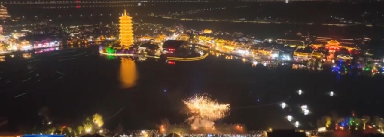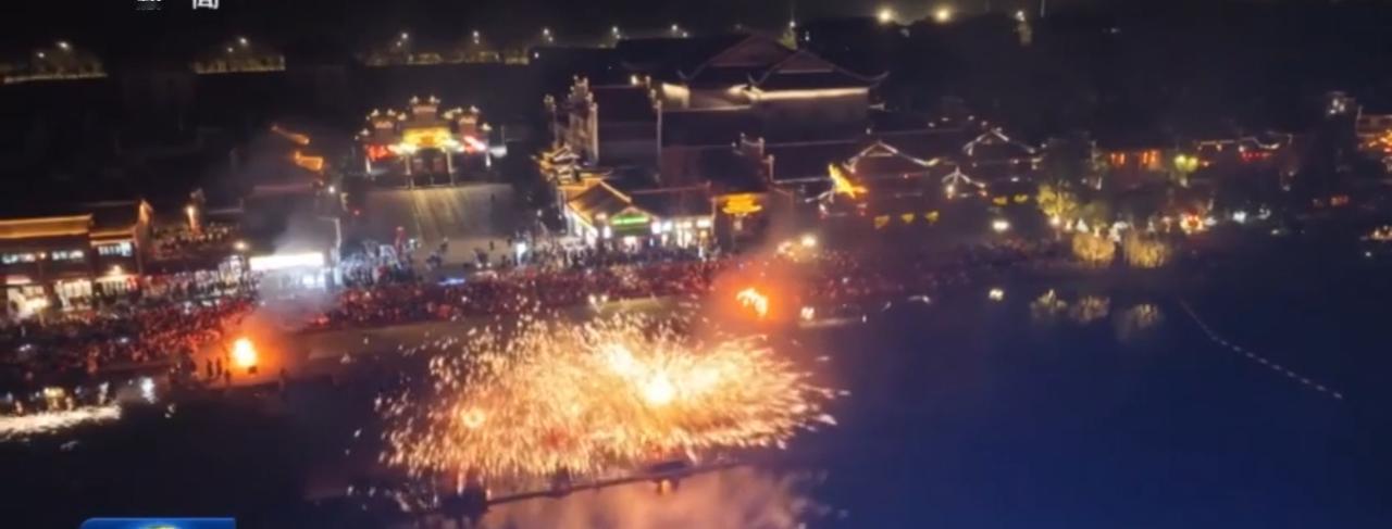 第一张图中,夜色里的街头亮起五彩的光影树,蓝绿紫的光线如枝蔓般舒展,人群驻足观赏、抬手记录,光影与人群的互动,勾勒出新年夜的浪漫与热闹。 第二张图展现了古城夜景,金黄的塔楼在夜色中熠熠生辉,湖面倒映着灯火,烟花在夜空绽放,城市的璀璨灯火与绚烂烟花相融,尽显新年的喜庆氛围。 第三张图里,非遗打铁花表演在古村上演,金色的铁花如星雨般洒落,周围的古建筑与熙攘人群构成热闹的画面,传统民俗的震撼与新年的欢腾在此刻交织。