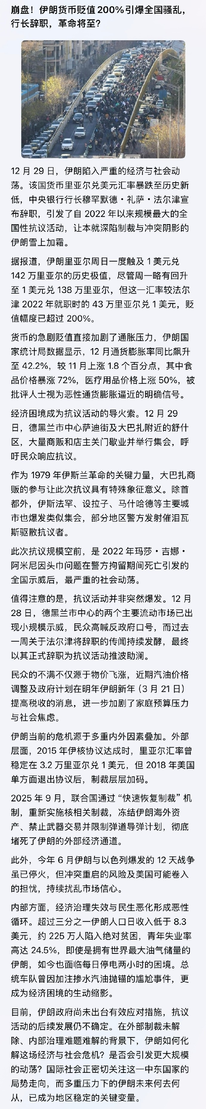 伊朗局势【伊朗多地爆发示威活动 本币疲弱拖累民生央行行长遭撤换】问AI:伊朗里亚尔目前官方汇率是多少,黑市汇率又是多少?答:伊朗里亚尔官方汇率:1美元约兑42,125里亚尔(2025年12月31日数据)黑市汇率:1美元约兑140万-145万里亚尔(2025年12月底至2026年1月初数据),两者差距达到34倍伊朗里亚尔在2025年底至2026年初经历了灾难性崩盘,黑市汇率暴跌至历史新低,引发全国多地大规模抗议活动。12月通胀率升至42.2%,食品价格暴涨72%,经济危机持续恶化。央行行长穆罕默德·礼萨·法尔津已于12月29日辞职,前经济部长阿卜杜勒纳塞尔·赫马蒂被任命为新任行长。全网热点共创计划烽火问鼎计划