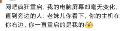 网吧疯狂重启,我的电脑屏幕却毫无变化,直到旁边的人:老妹儿你看下,你的主机在你右边,你一直重启的是我的