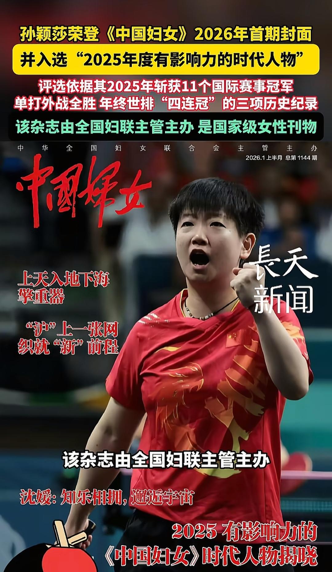 国家都在肯定她,她是我们女生的时代人物,向她学习! 孙颖莎荣登《中国妇女》国家级女性刊物。2026年首期封面。 2825年,莎莎单打外战全胜,11个国际赛事冠军,年终世排四连冠。 这一个个数字都是莎莎的辉煌,她走过的路一步一个脚印,实实在在!