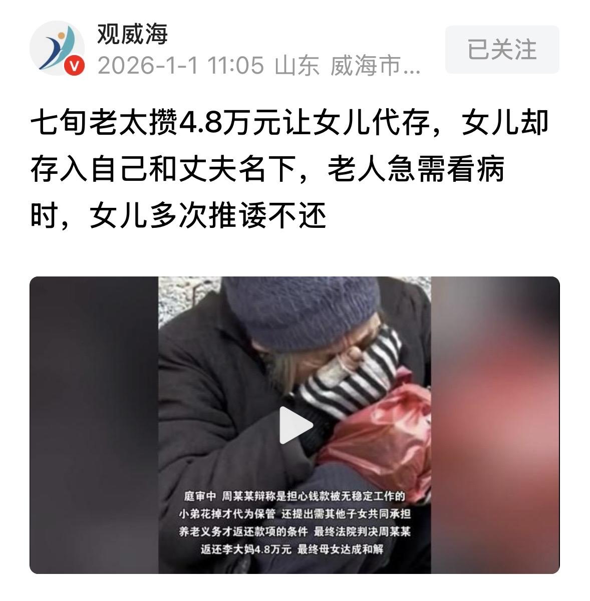 湖北枣阳,7旬老太省吃俭用大半辈子,攒下4.8万,她把钱交给大女儿,让其代存银行,没想到,大女儿却动了歪心思,私自以她和丈夫的名义将钱存入银行,直到老太病重需要用钱,多次要求女儿取款遭拒,这才发现存单已被挂失,钱已经被大女儿取走。老太上门要钱,大女儿却说,钱还你可以,以后你的生养死葬,我一律不管! 李大妈70多岁,她老伴走得早,留下她一人过日子。 好在5个儿女都拉扯大了,仨女儿俩儿子,都该成家的成家,立业的立业。 李大妈平时特别节俭,最后从牙缝里省出了点积蓄。 她想着自己岁数大了,腿脚不利索,去镇上银行不方便,就把这点钱托付给了住得近的大女儿周某某。 那是2024年刚过完年,2月13号,李大妈把攒了好久的3万块钱现金交到大女儿手里。 她说,闺女,妈走不动,你帮妈跑一趟银行,存个定期。 周某某满口答应,拿着钱去了。可她填单子的时候却没写母亲的名字,而是写了自己丈夫倪某的名字。 这事她没跟妈说,李大妈蒙在鼓里,以为钱安全存进去了。 半年后,李大妈又攒了1.8万。这次还是找大女儿去存。 周某某这回更直接,连丈夫的名字都懒得用了,直接存到了自己名下。 办完手续,她把两张存单往老妈手里一塞,李大妈看着上面的数字,心里踏实了。 到了9月初,李大妈身体抱恙,加上日常开销需要钱,就给大女儿打电话给说闺女,把那4万8取出来吧,妈看病要用。 这一要钱,周某某的态度立马变了。电话里推三阻四,一会儿说“存单找不到了”,一会儿说“银行系统坏了”。 李大妈急得没办法,又不敢耽误看病,就让小儿子去银行试试。 结果小儿子到了柜台,人家工作人员一查,说那两张存单早就被挂失了,钱也让人取走了! 李大妈一听这话,天都要塌了。钱没了?被谁取走了? 她一细琢磨,除了大女儿还能有谁? 老太太气得直哆嗦,上门找大女儿对质。周某某倒也承认钱在自己手里,但就是不吐口还钱。 母女俩吵得不可开交,最后闹到了村干部那里。 这家丑一外扬,周某某觉得丢了面子,干脆破罐子破摔,说钱我是不会轻易给的。 2024年9月23号,李大妈实在没辙了,一纸诉状把亲闺女告到了法院,还要请律师跟女儿对簿公堂。 法庭上,大女儿周某某也是一肚子苦水。她觉得自己委屈的很。 她说,我是老大,家里付出最多。妈偏心眼,钱要是给了小弟,他没个正经工作,两天就挥霍光了!我把钱扣着,是为了给妈留条后路,是替母保管罢了。 周某某甚至放出了狠话,说想要钱可以,把另外4个兄妹都叫回来,当面锣对面鼓说清楚。以后妈的生养死葬,我一分钱不出,也不伺候,全让他们管!只要答应这个条件,钱我就还。 这话一出,李大妈更是气得两眼一黑,说我现在还没死呢,你就拿养老来威胁我?这跟抢有啥区别? 那么,法院会怎么判? 《民法典》第985条:得利人没有法律根据取得不当利益的,受损失的人有权请求得利人返还取得的利益。 李大妈委托周某某代为存款,明确将4.8万元现金交予周某某,双方形成委托代理关系。 周某某作为受托人,本应按照委托人的指示将钱款以李大妈名义存入银行,但其擅自将3万元以丈夫名义、1.8万元以自己名义存入,未取得李大妈同意。 后续李大妈要求取款时,周某某又通过挂失方式取走钱款,主观上具有占有该款项的故意。 周某某的行为完全符合“无合法根据取得不当利益”的不当得利构成要件。 周某某提出“返还存款需以不承担赡养义务为条件”,但赡养父母是子女的法定义务,这个义务不因任何条件而免除,更不能作为返还财产的对价。 法官审理后表示,不管你们母女有什么心结,法律就是法律。 这4万8千块,是李大妈的钱,委托你存,你却存到自己和老公名下,最后还挂失取走,这就是典型的不当得利,没合法根据,你拿了好处,别人受了损失,这钱你必须吐出来。 至于周某某提的“不养老就不还钱”的条件,法官直接给驳回了。 法官说,你是老大,为家里付出多,心里有怨气可以理解,但不能拿老妈的救命钱当人质,更不能把养老义务当儿戏。这种附加条件,法律绝不支持。 最后,法院下了判决:周某某限期返还李大妈4.8万元。 虽然赢了官司,但法官看这对母女隔阂太深,要是就这么硬执行,以后老死不相往来,老太太晚年更凄凉。 法官又给周某某做思想工作,说你是当妈的人,也有老的那一天。钱还了,母女情分还在,钱不还,这辈子心里都有个疙瘩。 也许是法官的话戳中了痛处,也许是怕真被强制执行面子上更挂不住。宣判后,周某某终于松了口。 母女俩在法院达成了和解,周某某当场把4万8千块钱点给了李大妈。 对此,你怎么看? 关注@运良说法 学法律知识