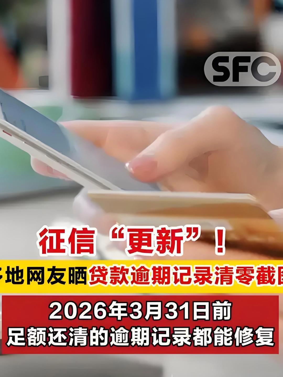 2026开年暖心好消息!好多人查征信都发现,之前的小额逾期记录居然清零了,属实是新年开门红~ 这都是央行征信一次性修复政策的福利,2020-2025年间单笔1万内的逾期,只要结清欠款,系统自动抹掉记录,免申即享不用跑手续,太省心了。 3月31日前还清符合条件的逾期都来得及,还多了2次免费查征信的机会。 这不是纵容逾期,而是给无心犯错的普通人一次翻身机会,征信有温度,守信更有底气。温馨提醒:任何收费修复征信的都是骗局,千万别上当!