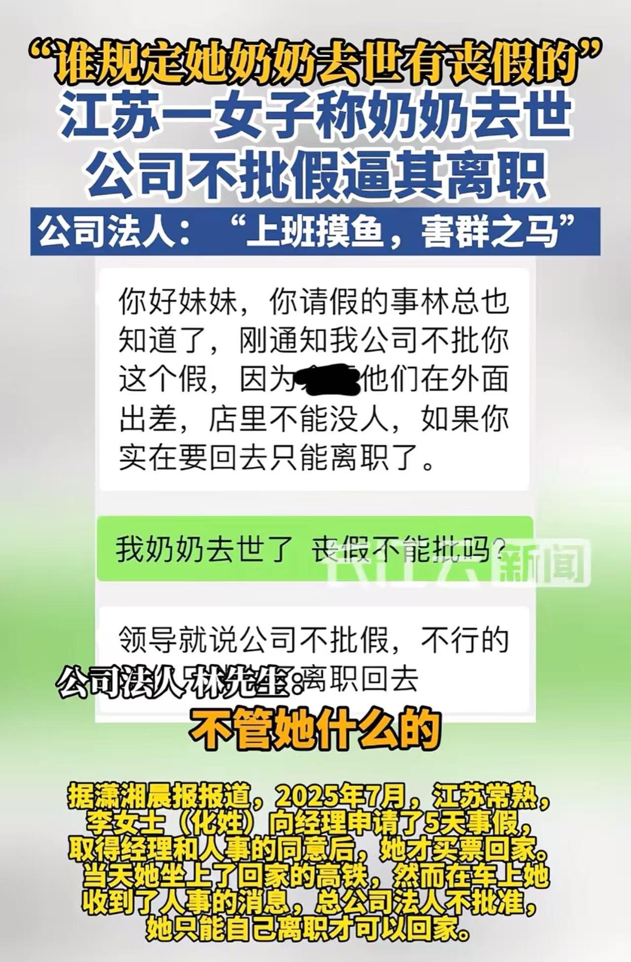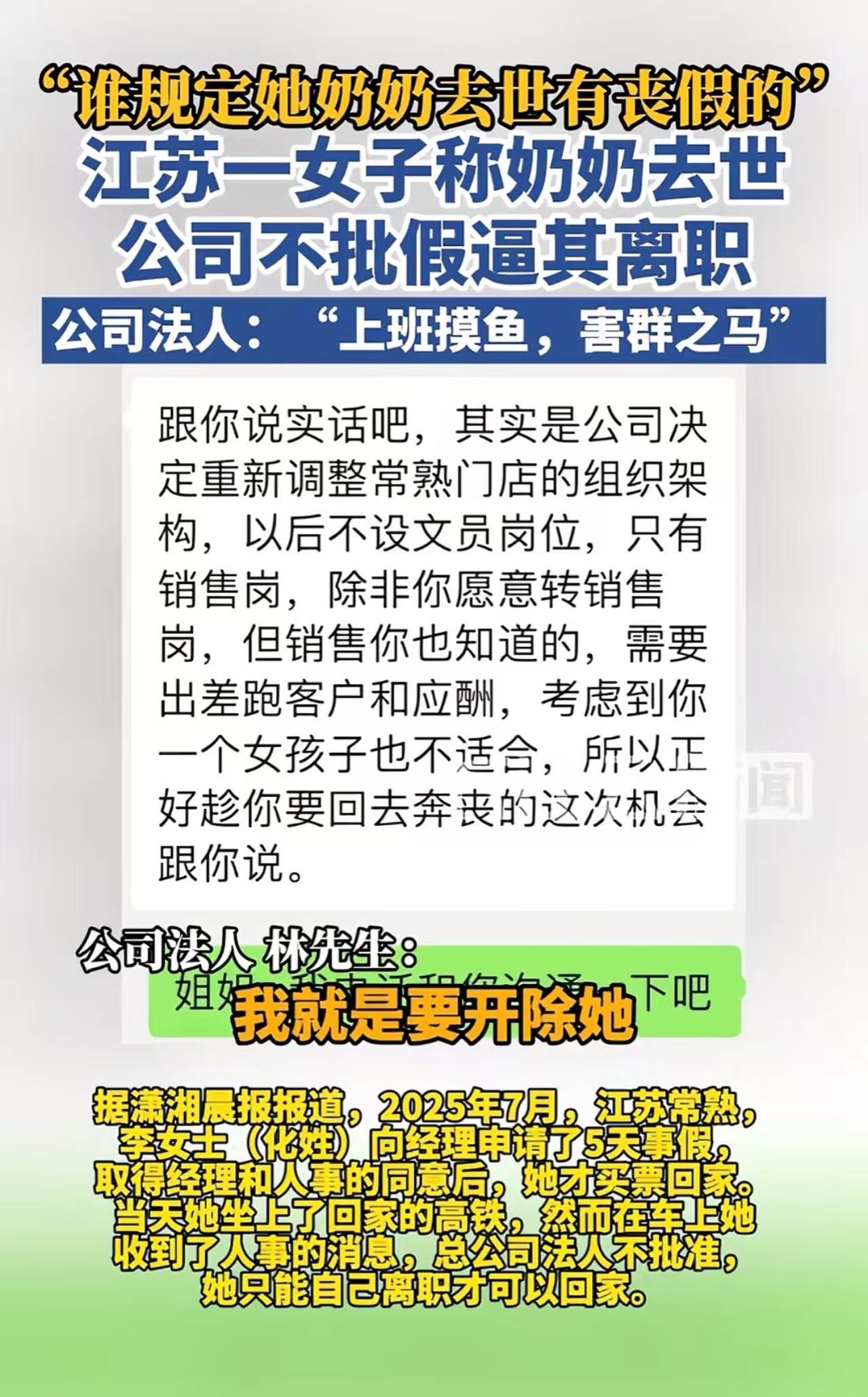 “谁规定她奶奶去世有丧假的!“江苏,一女子奶奶去世,公司老板却不批假逼她离职!老板:“谁家爷爷奶奶不去世,这有什么好请假的……” 李女士在一家公司担任文员一职。2025年7月,一个噩耗传来,她的奶奶永远地离开了她。那一刻,李女士悲痛欲绝,满心都是对奶奶的不舍与眷恋。 她强忍着内心的痛苦,向经理申请了5天的事假,只为了能回去送奶奶最后一程,尽自己作为孙女的最后一份孝心。 在得到经理和人事的初步同意后,李女士才放心地买了回家的票。可是当她刚坐上高铁,手机屏幕上突然弹出一条人事发来的消息,说公司老板不同意她请假,如果她非要请假,那就只能离职才能回家。 李女士感到无比的委屈和愤怒,她不明白自己究竟做错了什么,为什么会遭到这样的针对。她急忙询问人事原因,人事无奈地告诉她:“跟你说实话吧,公司正在进行架构调整,以后不再设置文员岗位,只有销售岗位了。除非你愿意转去做销售,但销售这份工作你也知道,需要经常出差和应酬,你一个女孩子可能不太合适。所以老板就想趁着你这次请丧假的机会,把你开除了。” 李女士听后,气得浑身发抖。她怎么也没想到,公司老板竟然会如此冷血无情,利用她奶奶去世这个特殊时刻,来达到开除她的目的。她觉得自己的尊严被践踏,亲情被漠视,愤怒之下,她将这件事情发到了网上,希望能得到大家的支持和帮助。 记者得知此事后,联系了公司的法人林先生。没想到,林先生的态度更加恶劣,他蛮横无理地说:“别跟我讲什么奶奶过世了,爷爷过世了。谁家的爷爷奶奶不会过世啊。李女士就是个害群之马,天天上班玩手机,哪个企业能容得下她。我就是要开除她,就是想趁着这次丧假,想要‘没有任何成本’地赶走她。” 目前,李女士已经申请了劳动仲裁,她要用法律的武器来维护自己的合法权益。 此事引发热议,有网友说,我们这种在爷爷奶奶怀里长大的,如果不能批假,那得多难过! 也有网友说, 公司这操作百分百违法,必须赔!就算法定丧假直系亲属不含爷爷奶奶,奔丧请假属情理之中,公司直接开除既违公序良俗,也属违法解除劳动合同。 还有网友说,有没有可能这个员工平时就一直在摸鱼,领导又不傻,但凡平时工作表现好,哪个老板会因为这种事卡员工? 在这起事件中,我们看到的不仅仅是一个员工与公司之间的纠纷,更是一个社会道德与法律底线的考验。公司老板以如此冷血的方式对待员工的丧亲之痛,不仅伤害了员工的感情,也严重违背了基本的人文关怀和道德准则。 即便员工平时存在一些工作上的不足,这也不应该成为公司在员工遭遇丧亲之痛时落井下石的理由。一个企业,如果连最基本的对员工的人性关怀都做不到,又如何在社会上立足,又如何能赢得员工的忠诚和社会的尊重? 法律是维护公平正义的最后一道防线,我们期待劳动仲裁能够给李女士一个公正的结果,也希望这样的冷血事件不再发生,让每一个员工都能在温暖和尊重的环境中工作。(来源:长江云新闻)