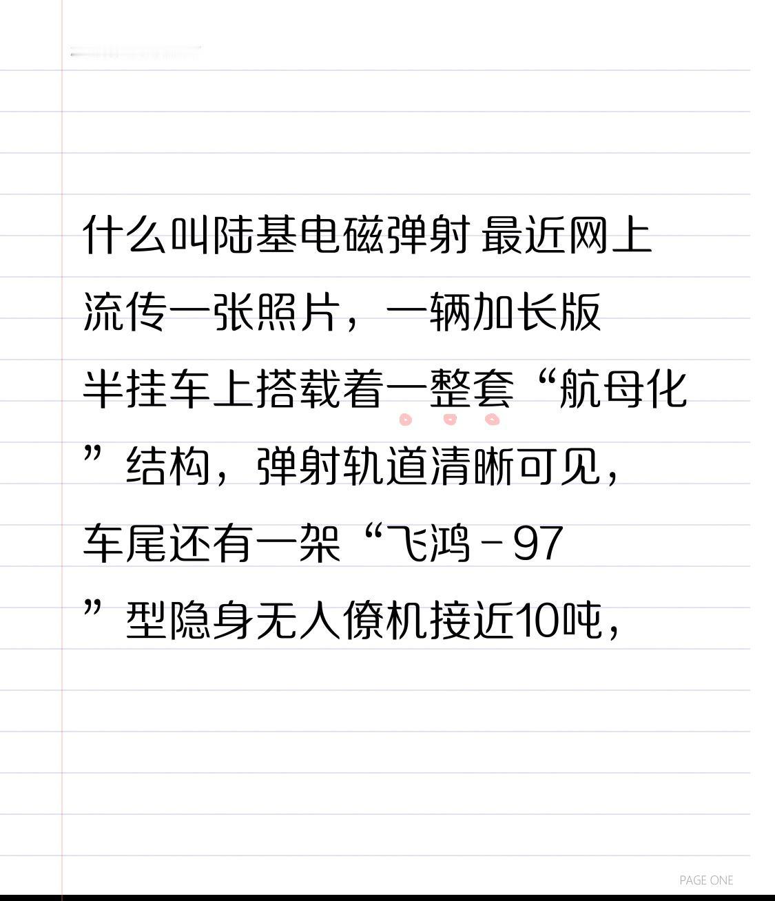 什么叫陆基电磁弹射 最近网上流传一张照片,一辆加长版半挂车上搭载着一整套“航母化”结构,弹射轨道清晰可见,车尾还有一架固定翼无人机,这就是“陆基车载电磁弹射系统”。 在传统认知里,电磁弹射几乎是航母专属,意味着万吨级平台、巨大发电能力等。但现在它被装到了卡车上。相关说明书显示,它主要用于大型固定翼无人机机动发射,强调“陆基”“机动”“快速部署”,发射轨道可分段运输、现场拼接,无需跑道助跑。 被曝光系统搭载的“飞鸿 - 97”型隐身无人僚机接近10吨,此前除陆地机场跑道和电磁弹射舰艇,难以起飞。有了它,众多先进无人机有望实现全域弹射,大大提升战争潜力。