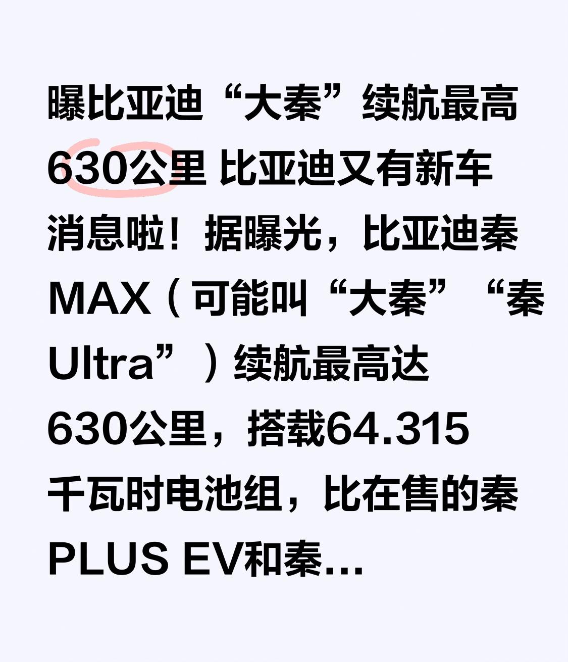 曝比亚迪“大秦”续航最高630公里 比亚迪又有新车消息啦!据曝光,比亚迪秦MAX(可能叫“大秦”“秦Ultra”)续航最高达630公里,搭载64.315千瓦时电池组,比在售的秦PLUS EV和秦L EV续航都强,后两者CLTC最高续航分别为510公里和545公里。 外观上,它沿用家族龙颜设计,前脸像秦L EV,灯组用银色装饰件连接。车身有半隐藏式门把手和贯穿式尾灯。尺寸为4866/1880/1495毫米,轴距2820毫米。动力是单电机,有高低功率可选。还提供多种选装配置。这新车续航提升不少,就看命名和定价咋样,能否成为畅销款呢?