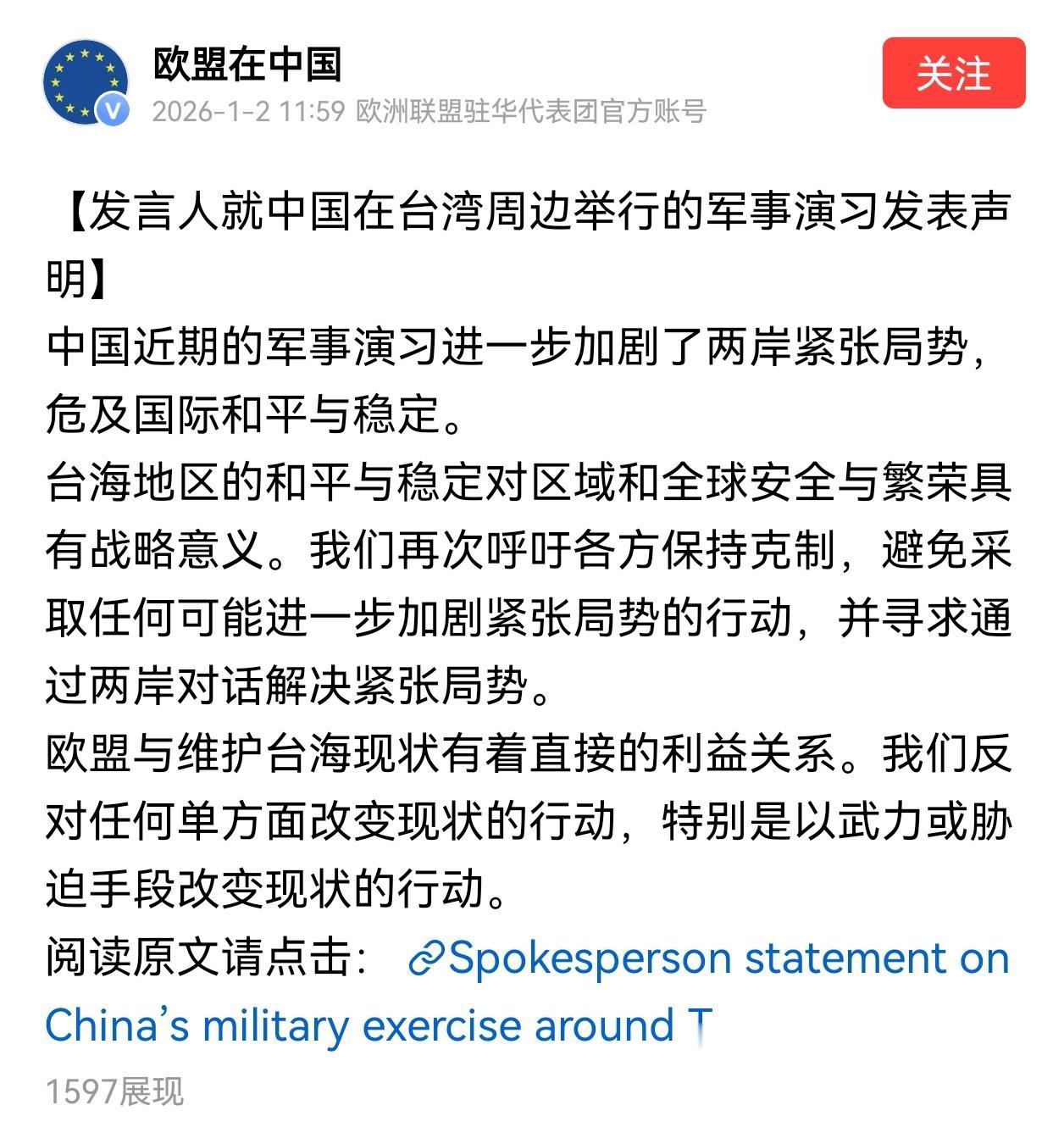 欧盟驻华代表团官方账号今天(1月2日)写道:“【发言人就中国在台湾周边举行的军事