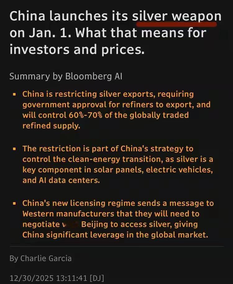 中国将于1月1日启动白银出口管制。这对投资者和价格意味着什么? 彭博社这段消息的公布!按照这个白银出口管制,是中国控制清洁能源重要转型战略的一部分!因为白银是太阳能电池板以及电动汽车和AI数据中心的关键组成的部分! 中国真的拥有如此大规模的白银精炼战略,那中国绝对有优势!全球重要领域,那中国拥有绝对的话语权!AI人工智能的快速发展,确实需要更多的材料来支撑!从芯片到贵重金属以及稀土元素,都是需要大规模的投入! 下来的白银价格是怎么样的走势?这个谁都不好说,谁也说不清楚,说不定后面还要持续上涨!短期有下行的风险!