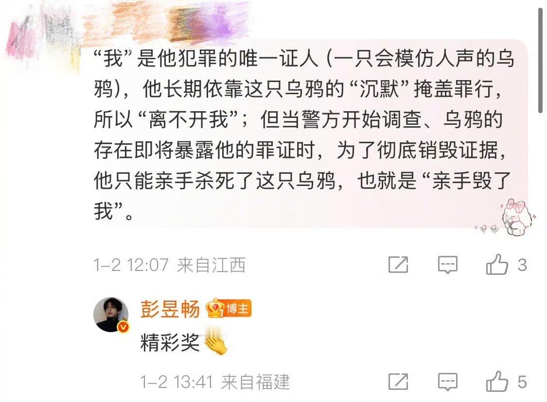 彭昱畅的评论区炸锅了 开年最会宣传作品的鬼才出现了!彭彭微博带粉丝玩海龟汤小游戏,把电影《匿杀》的细节放进汤面里,评论区秒变大型推理现场!带着汤面去看电影,肯定会有不一样的观影视角~