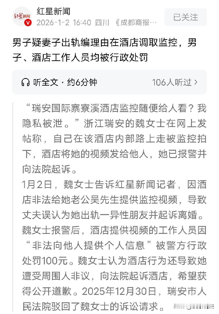 “不避嫌的代价!”浙江瑞安,晚上,女子陪男性朋友一起进酒店房间换鞋,丈夫给她打电话她没接,男性朋友换了鞋,女子和他离开酒店,谁料,丈夫跑到酒店撒谎说丢了东西要看监控,果然,酒店工作人员给他看了,这下丈夫拿到了妻子和男性朋友在停车场一起走的视频,怀疑她出了轨,打了她和孩子,去她单位闹,去岳父家告状,起诉闹离婚,女子认为酒店泄露她个人隐私,给她造成极大精神伤害,告上法院,索赔20000元精神损害抚慰金,并登报道歉,法院判决有亮点。 魏女士在2025年8月11号晚上6点多,去某酒店找她的一位男性朋友,把车停在了酒店外围停车场,等朋友来接她。 一开始,魏女士觉得朋友会请她在酒店里吃饭呢,结果,朋友出来接她时两人商量去别的地方吃。 朋友说他得先回去换个鞋,魏女士就跟着他一起进了酒店,到了朋友房间等他换鞋,大概2分钟后,她和换好鞋的朋友一起离开了酒店。 可这时候,魏女士还没料到因为她这次“未避嫌”行为,直接导致了丈夫醋意大发,对她产生误会,怀疑她外面有人了。 魏女士的丈夫吴先生为啥怀疑她呢? 因为,当时吴先生给妻子魏女士打电话,可她当时没有接,作为丈夫,他第一反应就是妻子身边可能有男的。 第二天,吴先生问魏女士跟谁在一起?都干什么了? 当时,魏女士只是说和朋友一起出去吃个饭,过多的也没有解释。 她越是说的模棱两可,丈夫就越怀疑她外面有人了。 谁料,吴先生为了证实自己的怀疑,偷偷跑到酒店,说他丢了东西,要看监控。 酒店工作人员王某也是热心,二话没说,就给吴先生调出监控,让他看了个仔细。 吴先生也是有手段,他不光看了监控,还拿到了魏女士和朋友在停车场一起走的视频。 吴先生拿到了“证据”,这下握住了妻子的把柄,不仅打了她,还把孩子也打了。因为不够解气,他还跑魏女士单位闹,去岳父岳母家告状,甚至起诉要求离婚…… 魏女士也没想到,酒店居然擅自把监控视频给丈夫,这下引起丈夫误会了她,搞的她的家庭一团糟。 这事你说去异性朋友住的酒店找对方,没有问题,但是不接老公的电话,陪异性朋友去房间换鞋,2分钟后就出来了也没问题。 但是随后又去别处吃饭,期间有很多种可能性,而且她老公第二天才问到她昨天去哪了?跟谁在一起,很可能当晚她没有回家。 再说朋友去房间换鞋用得着一起去吗?所以,魏女士的丈夫陷入怀疑,闹着要离婚。 魏女士非常愤怒,她认为酒店泄露她的个人隐私,非法向他人提供个人信息,直接报了警。 在本案中,酒店工作人员王某非法向他人提供魏女士个人信息,不过,王某没有收取任何费用,情节相对较轻。 《个人信息保护法》第66条规定:违反本法规定处理个人信息,或者处理个人信息未履行本法规定的个人信息保护义务的,由履行个人信息保护职责的部门责令改正,给予警告……拒不改正的,并处一百万元以下罚款。 公安机关综合考虑其行为的性质、情节以及社会危害程度等因素,对王某处以 100 元罚款。 这种处罚是在法律规定的合理范围内,符合对情节较轻的此类违法行为的处罚原则。 而吴先生因非法获取个人信息,也被罚款100元的行政处罚。 然而,这件事远远没有结束,魏女士觉得就是酒店泄露她的个人信息,导致丈夫误会,要和她离婚,给她造成了精神痛苦,带来了极大的伤害。 因此,她一纸诉状将酒店告上法院,索赔2万精神损害抚慰金,并要求对方登报道歉。 酒店这边觉得这事不怪酒店,毕竟是魏女士的丈夫吴先生隐瞒了事实,撒谎说丢了东西,酒店工作人员才提供了监控视频。 另外,该视频是公共道路区域,又不是在酒店里的视频。 魏女士和丈夫吴先生之间的误会,是他们夫妻之间不信任导致,和酒店提供视频没有因果关系。 魏女士则认为,自己正大光明,和男性朋友没有什么不合适的举动,比如搂抱、牵手这种越界的行为。若不是酒店提供视频,自己不会被丈夫揍,甚至要和她离婚,也不会因丈夫怀疑自己出轨闹的人尽皆知。 法院认为,根据《民法典》第1032条规定:自然人享有隐私权。任何组织或者个人不得以刺探、侵扰、泄露、公开等方式侵害他人的隐私权。 本案中,酒店工作人员未经魏女士同意将监控视频透露给他人,确实侵犯了魏女士的隐私权,但公安机关也对酒店工作人员进行了行政处罚。 这个案例的关键在于因果关系认定。 魏女士和丈夫的误会和争执,甚至被丈夫打了,以及丈夫闹离婚,主因是夫妻感情出现信任危机,沟通不到位导致。 但是,酒店泄露监控视频只是魏女士和异性朋友在停车场行走的过程,行为虽然存在不当,但和魏女士所说的精神伤害没有因果关系。 最终,法院判决:驳回魏女士的诉求。 有人说,瓜田李下,跟着异性朋友去房间换鞋,知道避嫌的话不会跟进去的,再讲究点的,不会去酒店这种地方见一个异性朋友的。 酒店错在不该提供视频,顾客说有丢东西,酒店很难拒绝的,都会让顾客看,但不能泄露个人隐私。 你怎么看呢?