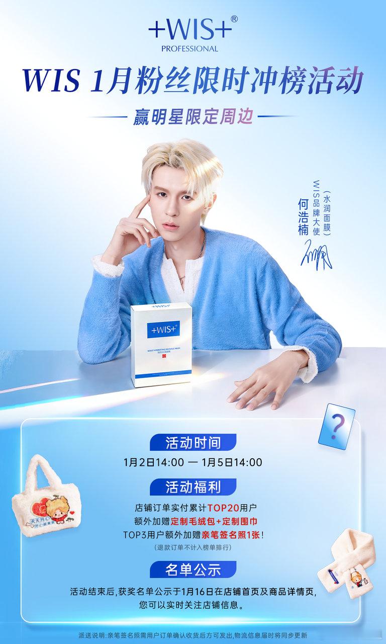 WIS 你是懂拿捏追星女孩的🤩!官宣何浩楠成为品牌大使,还带着超多惊喜周边和亲签来宠粉,这波联动我直接锁死!🌟新的一年要和和何帅 何浩楠 一起,用科学有效、温和低敏的护肤方式,养出闪耀好皮肤❤🔥亲签 + 周边攻略速速码住👇⏰ 时间:1 月 2 日 14:00天猫官方旗舰店冲冲冲戳👉点击购买何浩楠同款水润面膜点击购买何浩楠同款水润面膜✅ 周边直接送:满 299 就能抱走 "何" 你心意飞机盒、挂历、行李牌、三联吧唧等全套周边!推荐入面膜组合,性价比直接拉满~✅ 定制福利加码:1 月 2 日 - 5 日冲榜 TOP20,解锁定制毛绒包 + 围巾!满 399 前 100 单赠化妆包,满 520 前 100 单赠毛毯!✅ 亲签攻略敲重点:满 299 即可抽奖抢亲签!冲榜 TOP3 额外再得亲笔签名照 1 张!谁能拒绝本命的签名啊😭!1 月 17 号啵啵间还有隐藏惊喜,蹲住!🙌🏻禾苗们冲就完事了!get 何浩楠同款套组,亲签周边说不定就砸中你!WIS 水润面膜代言人何浩楠 WIS 熬夜急救面膜 何浩楠 种地吧少年