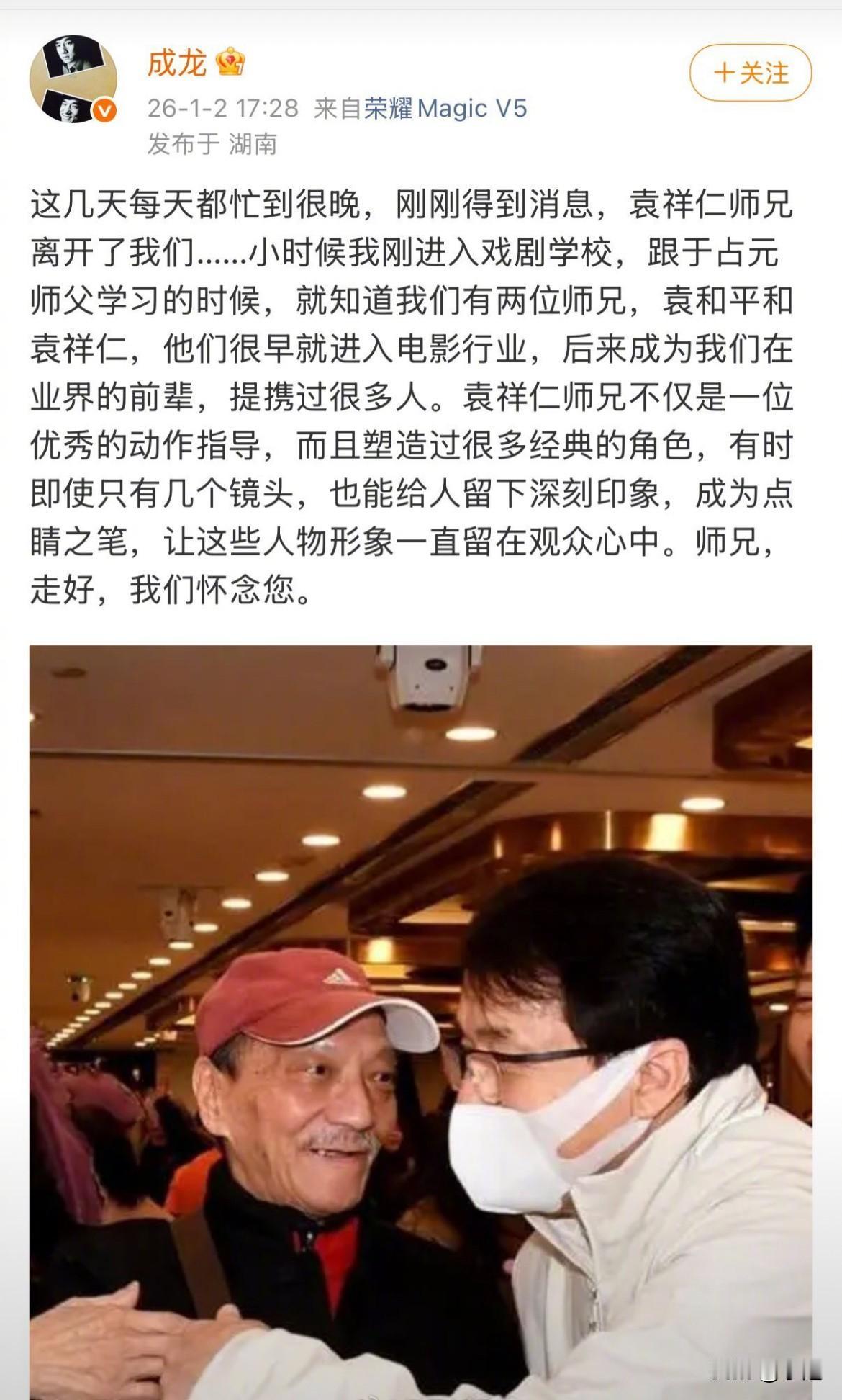 出事了。2026年第一天,香港电影又走了一位老戏骨。武术指导、演员袁祥仁,1月1号中午在香港伊利沙伯医院去世,69岁。 就在消息出来的前一天,成龙在武汉宣传新片。他还在感慨,说最近两年送走太多朋友,自己微博里全是悼念的文字。没想到,话刚说完,就又送走一位。 今天下午,成龙在社交平台发了悼文。他说自己忙到很晚才刚知道消息。他称呼袁祥仁为师兄,回忆起小时候刚进戏剧学校,跟于占元师父学艺时,就知道有袁和平、袁祥仁两位师兄,他们很早入行,后来成了业界前辈,提携过很多人。 成龙说,袁祥仁不只是优秀动作指导,还塑造过很多经典角色。哪怕只有几个镜头,也能成点睛之笔,让形象留在观众心里。 很多观众确实记不住袁祥仁的名字,但绝对忘不了他的脸。他是周星驰电影里的“乞丐专业户”。 《武状元苏乞儿》里,他是教周星驰“睡梦罗汉拳”的老乞丐。 《功夫》里,他是那个神秘兮兮,用十块钱向阿星推销《如来神掌》的乞丐。那句“我看你骨骼惊奇,是万中无一的练武奇才”,成了多少人的记忆。 到了《越光宝盒》,他第三次演乞丐,凑齐了“乞丐三部曲”。 他不光演乞丐。戏路广得很。 《太极张三丰》里,他是凌道士。 《精武英雄》里,他演探长。 最绝的是《大内密探零零发》,他反串演无相王的妻子,成了不少人的“童年阴影”。 他出身正宗的武术世家。父亲袁小田是中国电影第一位武术指导。哥哥是“天下第一武指”袁和平。他们兄弟组成了鼎鼎大名的“袁家班”。 在幕后,他的成就更大。1991年,他担任电影《黄飞鸿》的武术指导,拿了第11届香港电影金像奖最佳动作指导奖。他还去过好莱坞,参与《夜魔侠》、《霹雳娇娃》这些片的动作设计。 但就是这么一位电影圈的老人,晚年身体很不好。去年拍电影《红嫁衣》时,他已经瘦得皮包骨。知情人士说,他患有肺水肿,走路喘气,几步路就要休息。片场40度高温,他需要坐轮椅,由工作人员抬上山去指导拍戏。 即便这样,他也没离开片场。今年5月,他接受采访时还说,自己想干到100岁。热爱这两个字,他是用命在扛。 他的丧礼定在2月1号,在香港世界殡仪馆设灵。一个熟悉的身影,从此只能留在胶片里了。 成龙前两天说,他现在看到任何人找他,都会立刻回电话;有任何想做的事,也立刻就去做,不想再留遗憾。这话现在听起来,格外沉重。 那个卖《如来神掌》的乞丐走了。江湖里,又少了一份熟悉的滋味。