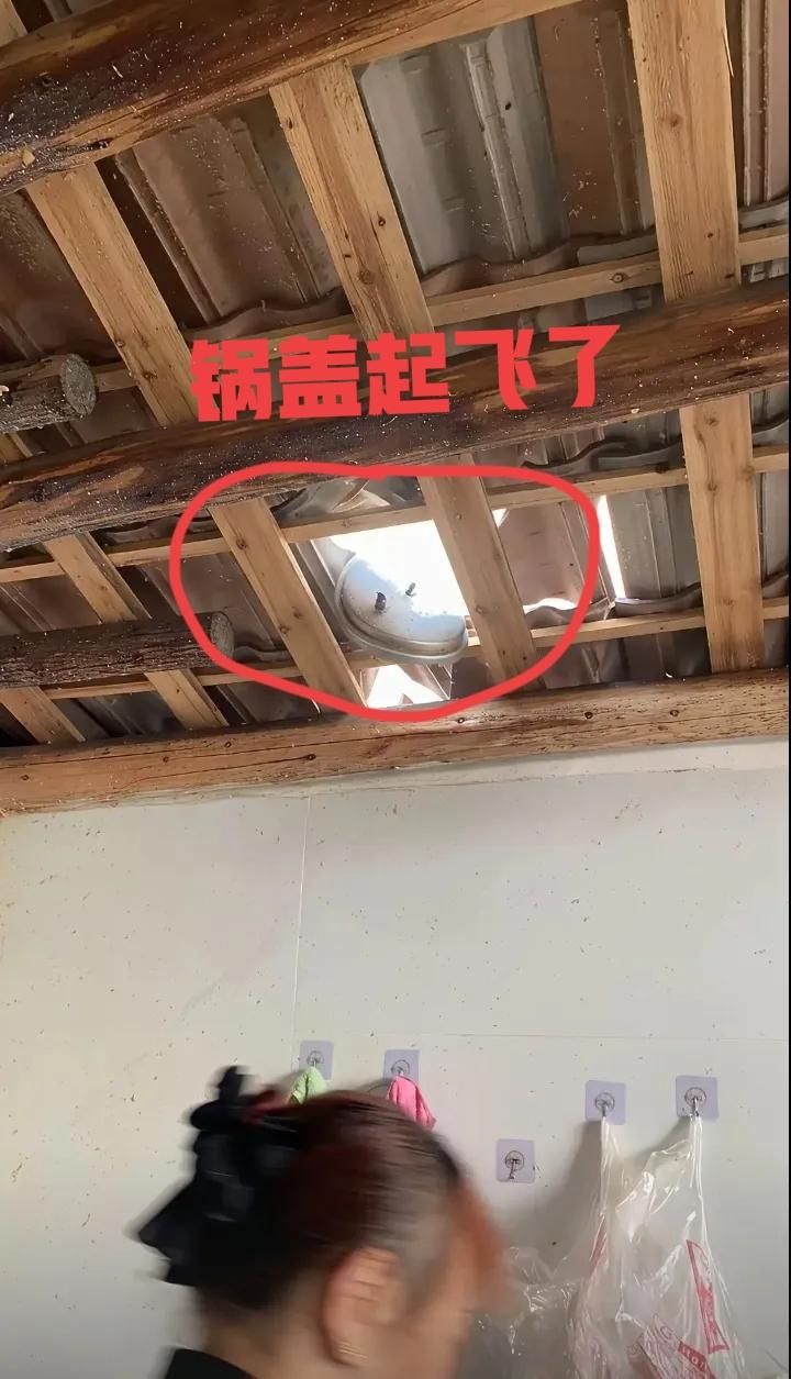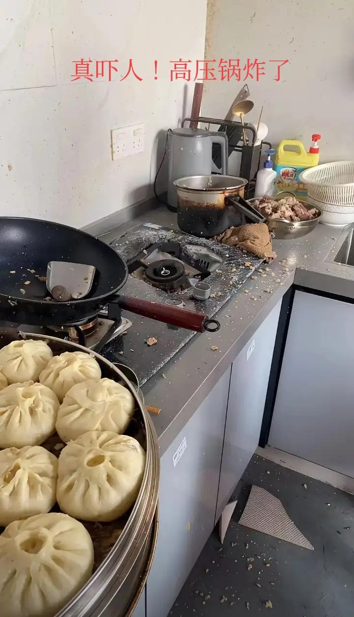 网友: 真吓人!高压锅炸了!锅盖飞天了,还好没伤到人,用老式高压锅切记注意安全![泪奔]
