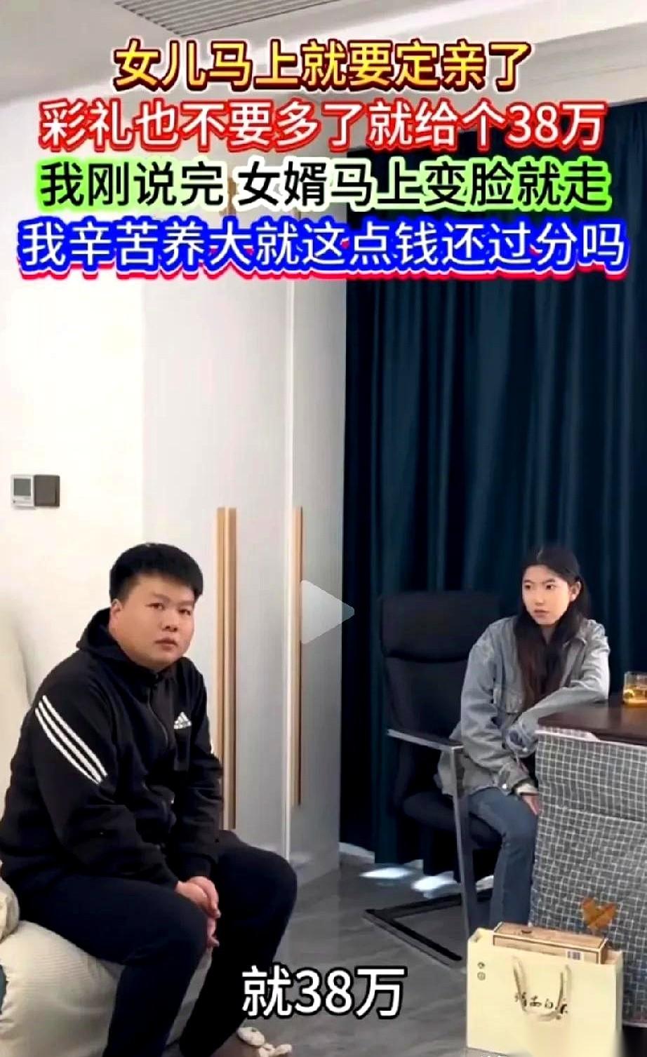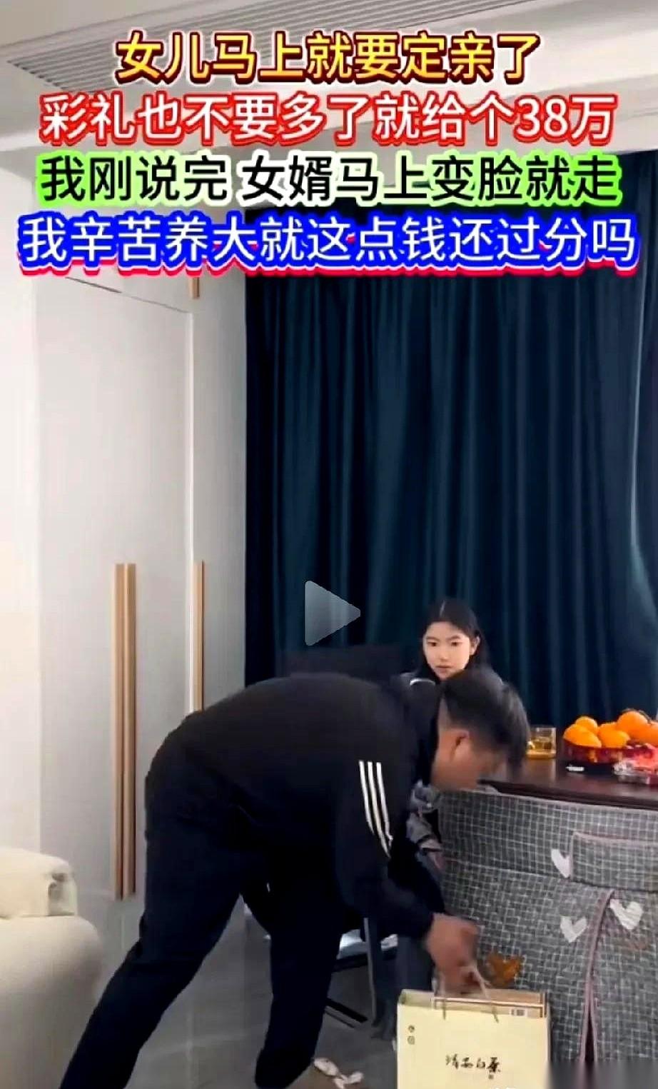 小伙子相亲认识的对象,处得不错,眼看就要订婚了。 他拎着两箱好酒好茶,第一次上门拜访,气氛本来挺热络。 未来丈母娘抿了口茶,笑呵呵地开了口:“彩礼嘛,38万,少一分,我女儿都不会嫁。” 客厅里的空气瞬间就停了。 小伙子没吭声,没讨价还价,甚至都没看一眼坐在旁边的女朋友。 他就那么盯着丈母娘看了两秒,然后,一个动作让所有人都没反应过来——他俯下身,把刚放在地上的两箱礼品,重新拎在了手里。 站直,转身,一步就迈到了玄关。 “叔叔阿姨,打扰了。”他声音不大,但清清楚楚,“不耽误你们给闺女找个有钱的主儿。” 门轻轻带上,人已经走了。 从丈母娘开口要价,到他拎着东西出门,全程不到一分钟。 这哪是谈婚论嫁,这是明码标价。可惜,人家不陪你玩了。