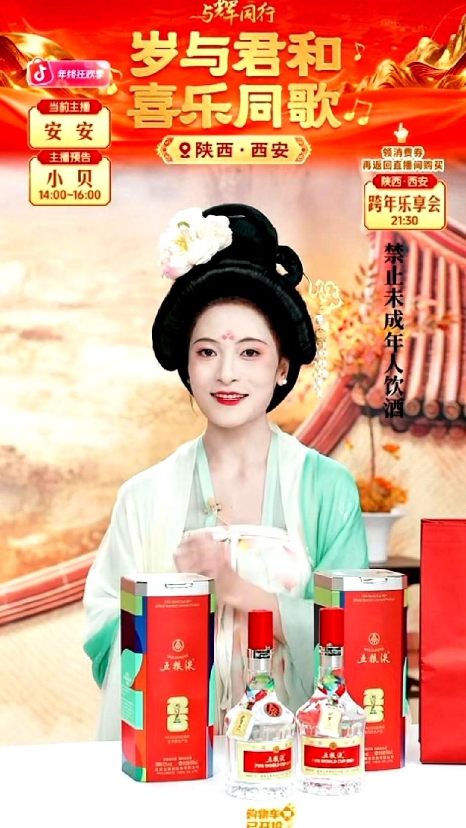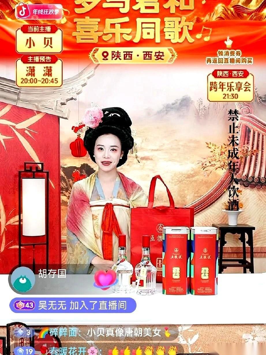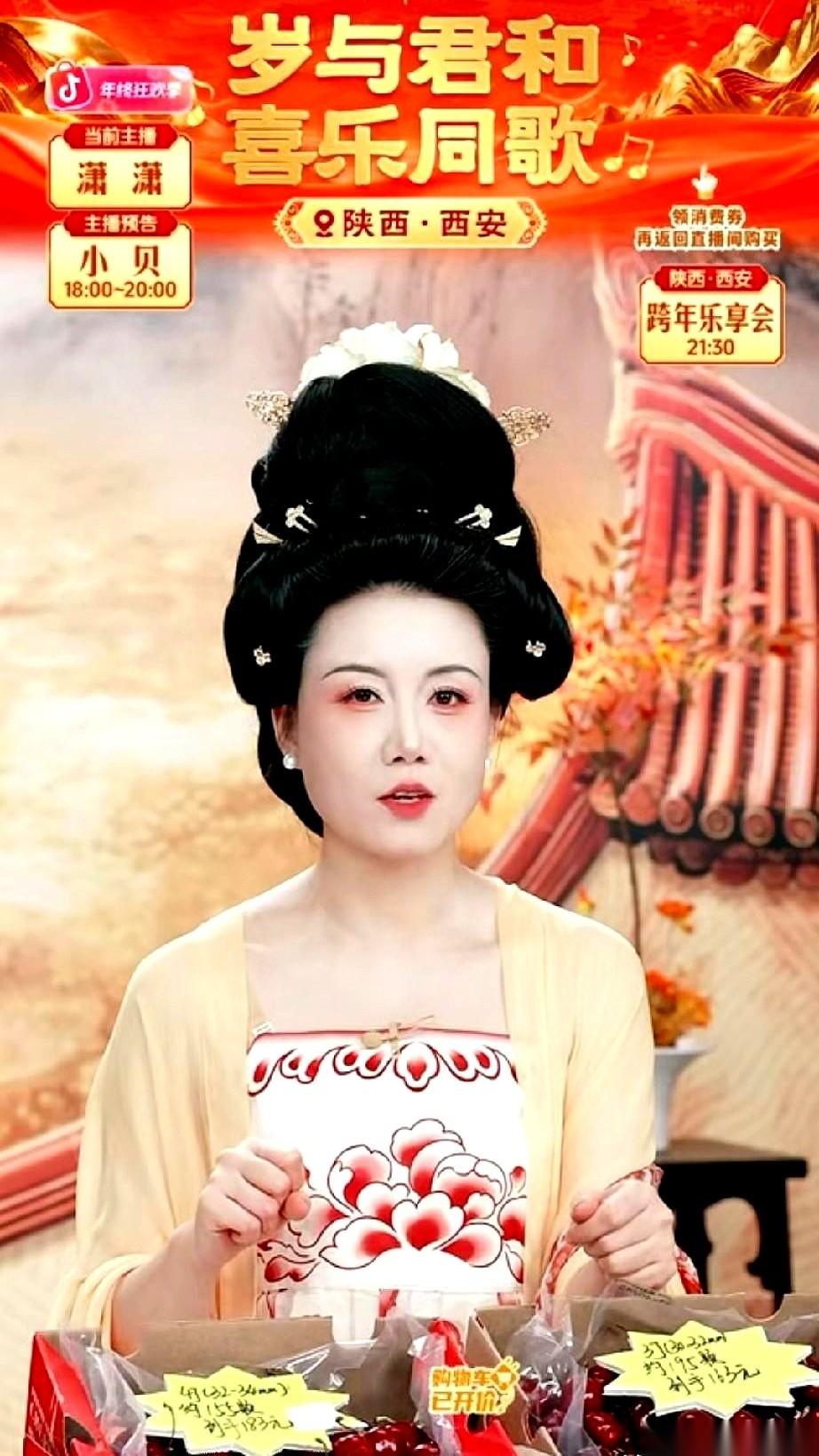 与辉同行跨年这场,刚开播就搞了个大动作。 小贝对着镜头宣布,8点45分,直播间准时断播。 所有人都以为出了什么状况,结果是为了让大家9点能投屏到电视上看,专门留出的技术时间。 但这都不是重点。 重点是镜头一转,满屏的大唐美人。一个个发髻高耸,眉心点着花钿,宽袍大袖一甩,仿佛直接从古画里走了下来,站在了高清镜头前。 那一步一晃的姿态,那雍容华贵的气场,直接把直播间的天花板给顶穿了。 这哪是直播,这简直是把大唐盛景直接搬进了2024年。就这阵仗,你说它是哪个台的跨年晚会我都信。