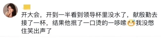 开大会,开到一半看到领导杯里没水了,献殷勤去接了一杯,结果他抿了一口烫的一哆嗦,我没憋住笑出声了