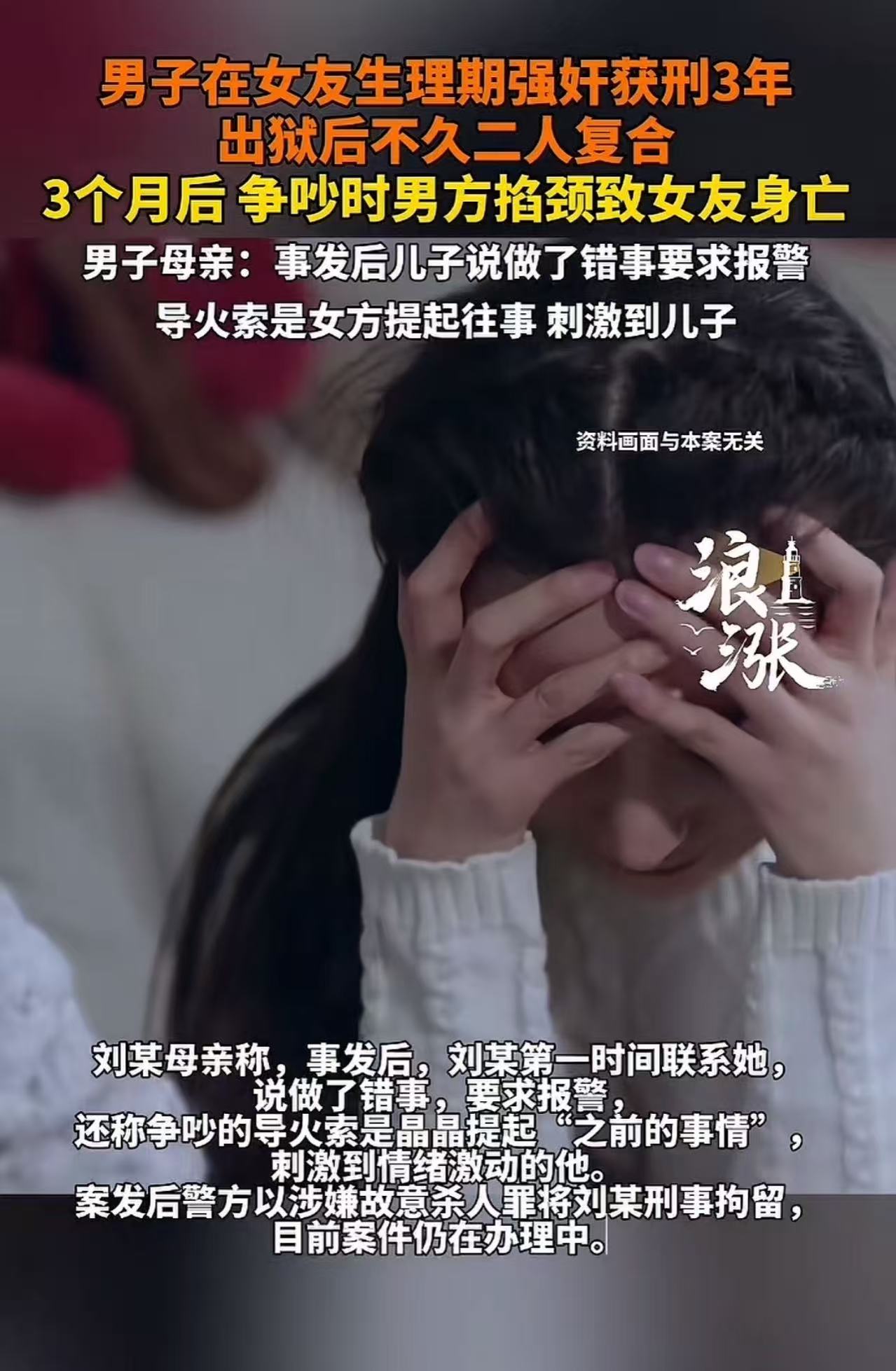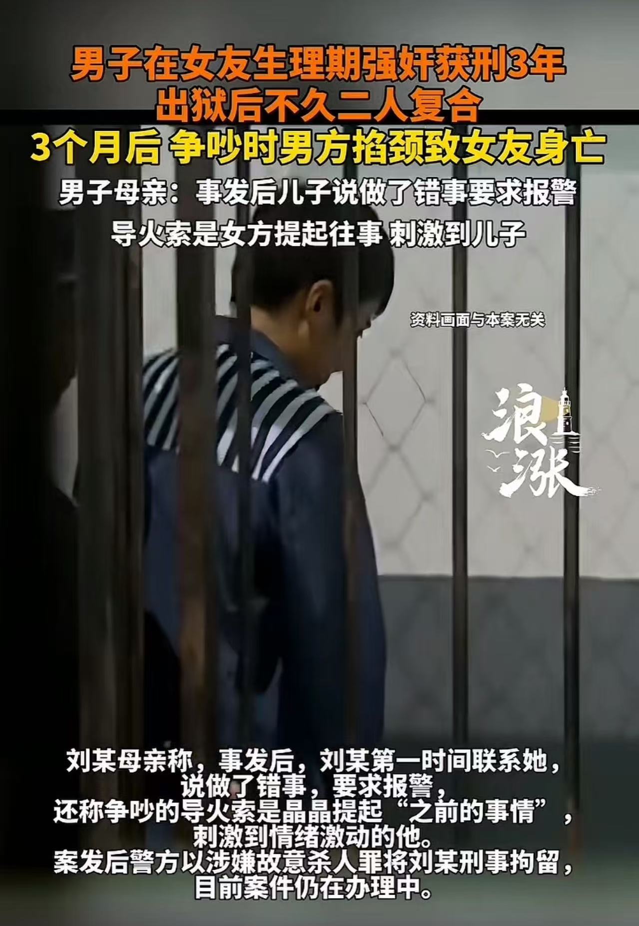男子性侵生理期女友,女友报警被强奸,男子获刑3年!出狱后不久,二人复合,3个月后又因争吵,男子掐死女友!男子母亲:“争吵的导火索是女友提起“之前的事情”,刺激到情绪激动的他。”网友:这样还复合,这女的心也是真的大?