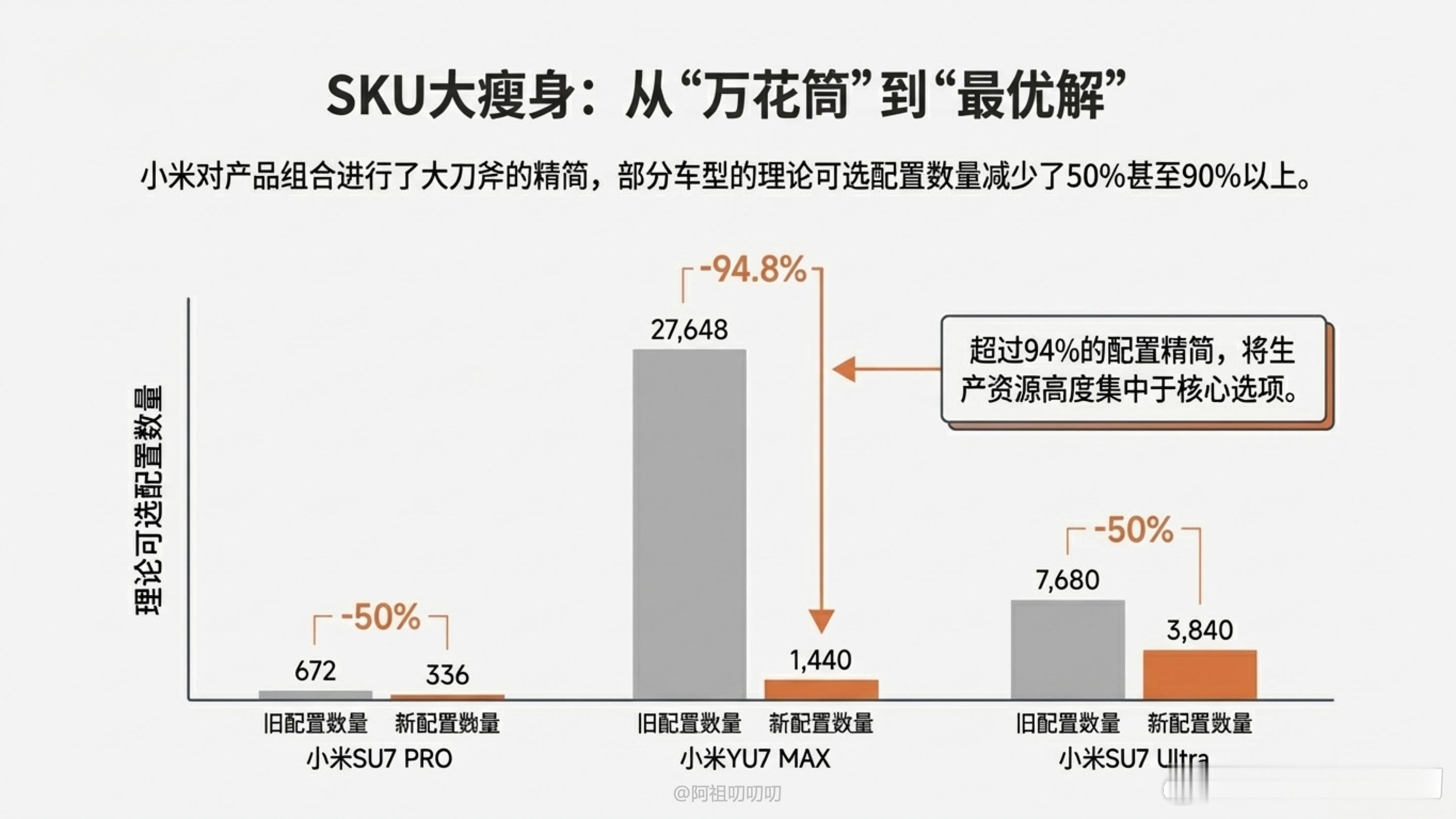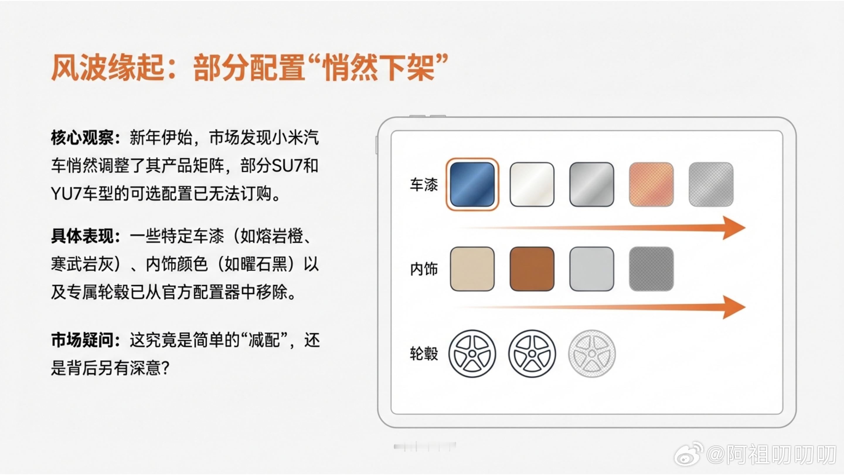 小米汽车年后砍配置 核心是效率和止损的双重考量。开年就发现小米汽车不少配置悄悄停售了,YU7的部分车漆、专属轮毂都下了架,SU7也只保留了部分配置(大概率只有现车)。其实这波操作根本不是随便减配,核心是冲着生产效率和避免亏本去的。从生产端来看,多一个配置选项,对产线就是不小的负担。小米订单爆火但产能一直爬坡,那些个性化配置会大幅拉长产线切换时间,比如换个车漆颜色、换套轮毂,生产线就得调整参数、适配物料,直接拖累整体交付节奏你觉得哪些停售的配置最可惜?
