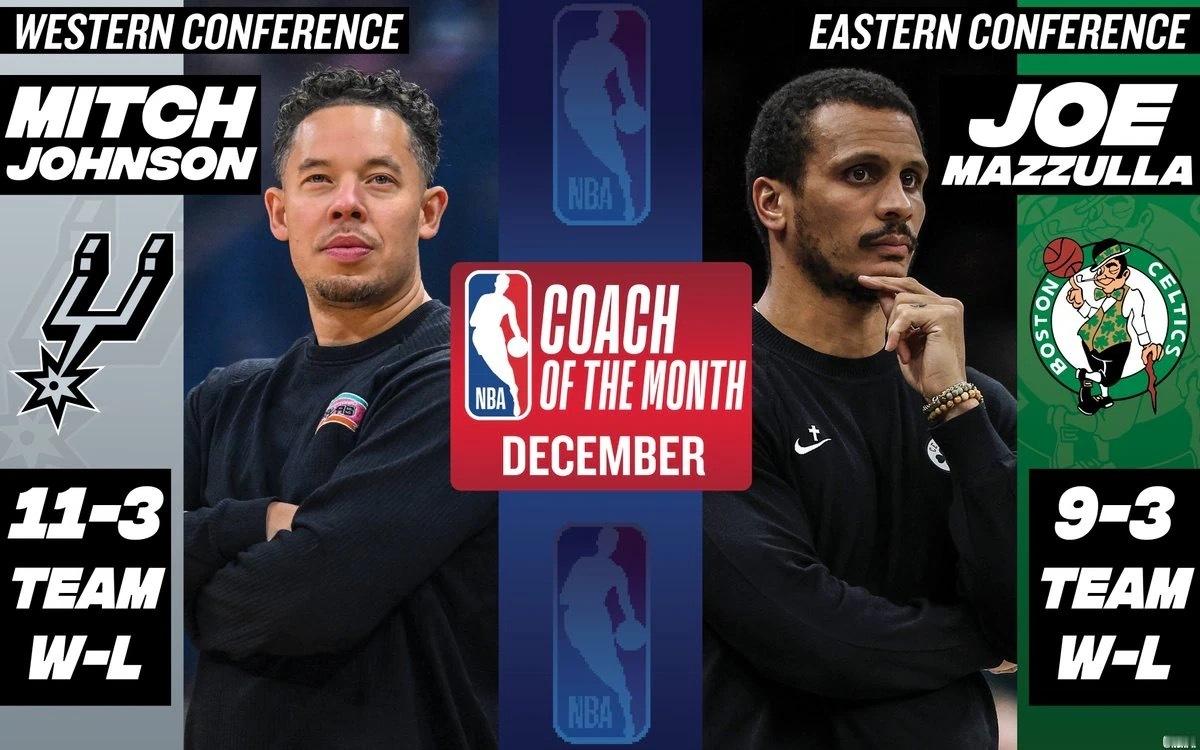 🖊️月最佳教练:西部米奇 东部马祖拉连续2月当选!NBA官方宣布,凯尔特人马祖拉与马刺米奇·约翰逊分别当选12月最佳教练。米奇带马刺在12月取得11胜3负的战绩;马祖拉带队战绩则是9胜3负。🔥其余提名者:西部:阿德尔曼(掘金)、戴格诺特(雷霆)、芬奇(森林狼);东部:小JB(活塞)、麦克·布朗(尼克斯)、费尔南德斯(篮网)。圣安东尼奥马刺NBA吐槽大会超话创作官