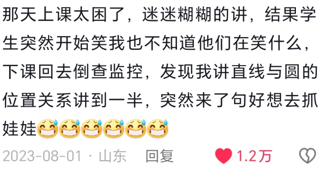 那天上课太困了,迷迷糊糊的讲,结果学生突然开始笑我也不知道他们在笑什么,下课回去倒查监控,发现我讲直线与圆的位置关系讲到一半,突然来了句好想去抓娃娃