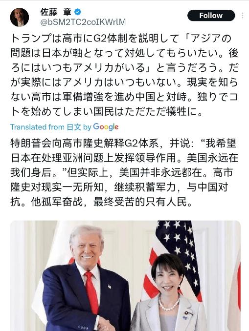 在日本首相高市早苗与特朗普通话之后,2026年1月3日,日本知名媒体人佐藤章写到,特朗普会向高市早苗阐释G2体制,并表示“亚洲的问题,希望能由日本作为核心去应对,美国会永远做你们的后盾”,可实际情况却是,美国从来不会真正留在身后撑腰,对现实一无所知的高市执意推进军备扩张,选择与中国对峙,最终只会让日本独自挑起事端,而民众只能沦为无端的牺牲品。 纵观历史,美国对亚太盟友的安全承诺始终随着其全球战略的需要而波动,从“亚太再平衡”到“美国优先”,再到“一体化威慑”,不同时期的政策重心不断调整,不变的则是美国对国家利益的根本权衡。 日本在安全上长期依赖美国,但近年来,面对中国崛起和地区格局变化,“战略自主”的呼声日益高涨,从安倍晋三解禁集体自卫权,到如今高市早苗推动军备扩张,皆是这一路线的延续。 特朗普所谓“由日本核心应对”,表面上是对日本角色的提升,实则暗含了责任转移的潜台词,美国希望盟友在防务上承担更多前线责任,甚至分担风险。 这种“战略赋权”听起来振奋人心,却可能让日本陷入两难:既渴望自主,又难以摆脱依赖,既想提升存在感,又恐被推至风口浪尖,美国在乌克兰、中东等地的选择性干预已多次表明,其安全承诺的兑现程度,最终取决于本国利益的计算。 高市早苗推动军备扩张,背后是日本的双重不安:既担心美国保障的可信度下降,又忧虑中国影响力持续扩大,日本已将防务开支提至GDP的2%以上,并寻求发展远程打击能力,试图构建“反击能力”。 然而,军备扩张真能带来安全吗?历史反复证明,单方面强化武力往往加剧紧张、引发对抗。 日本若过度倾向强硬路线,很可能陷入“安全自主性陷阱”,越是追求自主,越刺激地区不稳定,反而加剧自身风险,而一旦危机发生,所谓的“美国后盾”能否及时有效,仍是一个未知数。 东亚的安全格局本质上是相互依存的,中日经济深度融合,产业链紧密交织,对抗的成本极高。 大多数日本民众对军事冲突持谨慎态度,佐藤章所警告的“民众沦为牺牲品”,并非危言耸听,而是对可能代价的清醒认知。 东亚的安全未来,不应被简化为“对抗”与“依附”的二选一,多边对话、危机管控、经济合作,都是降低风险的有效途径。 日本在提升防御能力的同时,若能同步投入于区域信任建设与外交渠道拓展,将有助于塑造更稳定、可持续的安全环境。 值得注意的是,美国内部对亚太盟友的期待亦存分歧:一部分人希望盟友“多出力”,另一部分则担心过度武装可能引发误判,日本如何在同盟框架内找准自身定位,仍需精细平衡。 特朗普对高市早苗的表述,无论具体措辞如何,都揭示了一个残酷的地缘政治现实:没有任何国家会为他国利益无条件承担风险,将国家安全完全寄托于他国的“后盾承诺”,如同在流沙上筑堡。 真正的安全应建立在“韧性”之上,这不仅指适当的自主防御能力,更包括稳健的区域经济联结、灵活多元的外交网络,以及深厚的社会抵御危机能力。 日本作为亚洲重要国家,其安全战略应超越“依附-对抗”的二元思维,探索一条中间道路:在确保必要自卫能力的同时,积极扮演区域稳定促进者的角色。 战后日本曾凭借和平宪法与经济繁荣,赢得国际社会的广泛尊重,如今面对新格局,日本需要的不是激进的“武装自主”,而是审慎的“战略智慧”,东亚的未来不应成为大国博弈的棋盘,而应成为共同发展的平台。 日本若能以建设性姿态,主动倡导多边安全对话、推动建立危机管控机制、深化与周边国家的经济社会纽带,或许能走出一条既保障自身安全、又促进区域稳定的新路。 这远比盲目相信外部“承诺”、陷入对抗螺旋更为务实,也更能赢得长远的历史认可。 在充满不确定的时代,最大的风险往往来自对虚幻承诺的轻信,以及由此催生的战略冒进,亚洲需要的不是新一轮军备竞赛,而是冷静、务实、富有创造力的安全架构思考。 只有这样,各国人民才能真正免于冲突的阴影,共享和平与发展的长久红利。