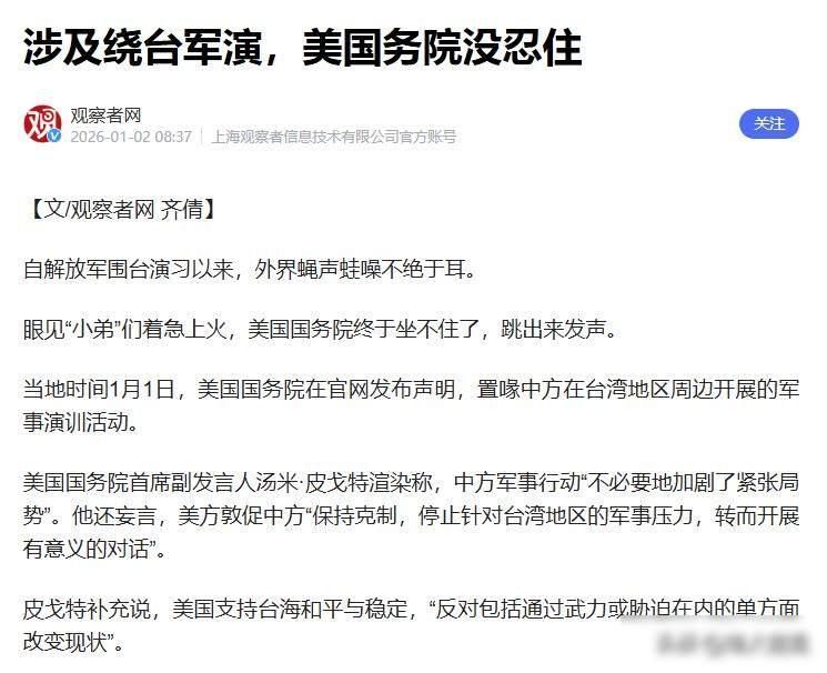 美国国务院喊话,中国照买大豆,谁在怕断供? 2026年1月1日,美国国务院发言人皮戈特发表言论,批评中国开展军事演习加剧台海局势紧张,然而就在同一天,中国仍按合同继续从美国购买大豆,已接收800万吨货物,剩余400万吨也安排妥当,将于二月底前交付,一边在口头上表达不满,一边在经济上保持往来,这种情况引人关注。 这事要从2025年底说起,12月29号,解放军启动“正义使命-2025”环台军演,展开实弹封锁行动,这次军演之所以强硬,是因为美国刚刚批准了111亿美元的对台军售,提供海马斯、M109A7这类重型武器,这不是例行演习,而是直接针对美国的举动,表明如果美国干预台湾问题,解放军就会采取实际行动。 美国政府嘴上说得响亮,行动上却没那么坚决,国务院官员急着表态,特朗普本人倒没放狠话,还对记者提到中美关系挺融洽的,他当然得这么说,毕竟2025年夏天中国暂停采购美国大豆后,中西部农场主几乎陷入绝望,要是现在再出现供应中断,选举年里特朗普根本承受不住这种压力。 中国采购大豆这件事,从来不是被动接受订单,而是主动掌握节奏,2025年5月到10月期间,中国基本没有购买美国大豆,转向巴西和阿根廷下单,9月底仅在阿根廷就买了130万吨,10月开始恢复采购,11月又暂停,12月加大进货量,全年计划采购1200万吨,实际支付了800万吨,剩下400万吨留着作为筹码,想什么时候用就什么时候使用。 其他国家也跟着起哄,法国、德国、日本、英国都跳出来表示关切,就连立陶宛也凑热闹,日本媒体还拿出所谓民用船只登陆演练的卫星图,其实根本没有新内容,他们就是在配合美国演戏,用技术名词包装政治立场,假装自己有理有据,其实还是老一套。 中国这边也没被吓住,军演继续进行着,订单也照常处理,一切都在按计划做事情,美国选在新年第一天挑起事端,明显不是真心想吵架,它首先做给国内农业州的选民看,展示自己对华强硬的态度,其次试探中国会不会因为经济利益做出让步,最后为2026年中期选举做准备,把责任推给所谓的中国威胁,转移大家对国内经济问题的关注。 中国在采购大豆这件事上已经掌握得很熟练,不是单纯依赖美国供应,而是懂得控制节奏,美国一旦进行军售活动,中国就暂停购买,等到双方谈妥之后,订单马上恢复,这种灵活操作比直接中断供应更有效,既不会损害经济,又能形成压力,美国方面可能还以为中国离不开他们的供应,但实际上中国已经把供应链铺开了。 巴西和阿根廷这两年向中国出口的东西增加了很多,特别是阿根廷干脆把关税降到零,他们这么做是想抢占市场,中国这边也早就开始分散采购渠道,美豆的份额正在被慢慢吃掉,这不是靠情绪,是靠实际的贸易安排,美国现在着急,是因为他们还没意识到自己早就不是唯一的选择了。 说实话,这种博弈最能看出谁更能沉住气,中国不喊口号也不急着解释,该买的时候就买该停的时候就停,美国那边倒是急急忙忙到处发声,结果回头一看,他们的农场主还在等着中国的订单到账,这种局面里谁依赖谁其实挺清楚的。