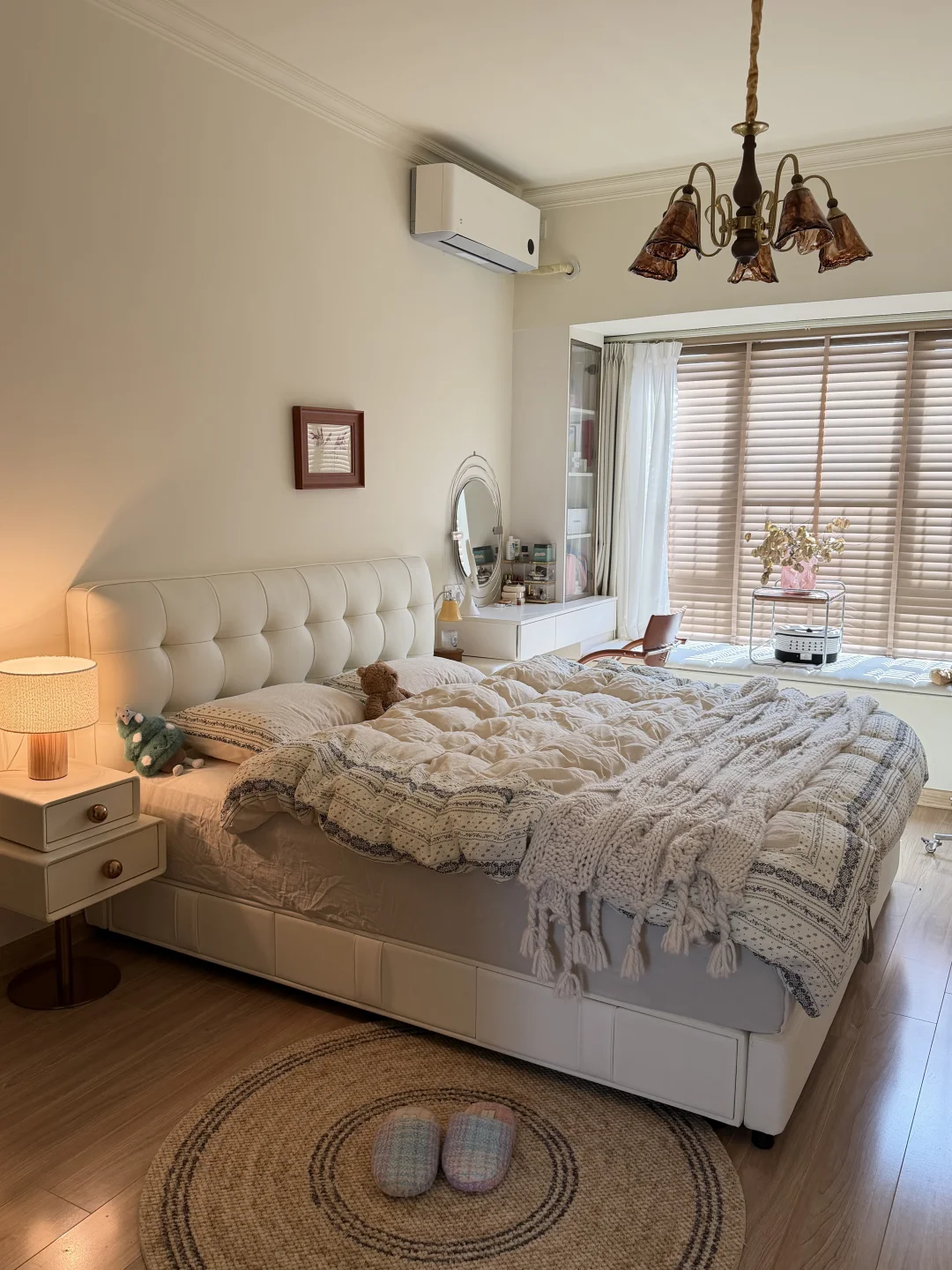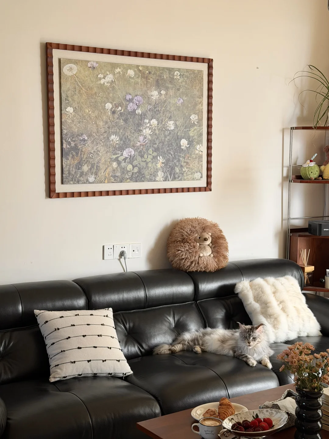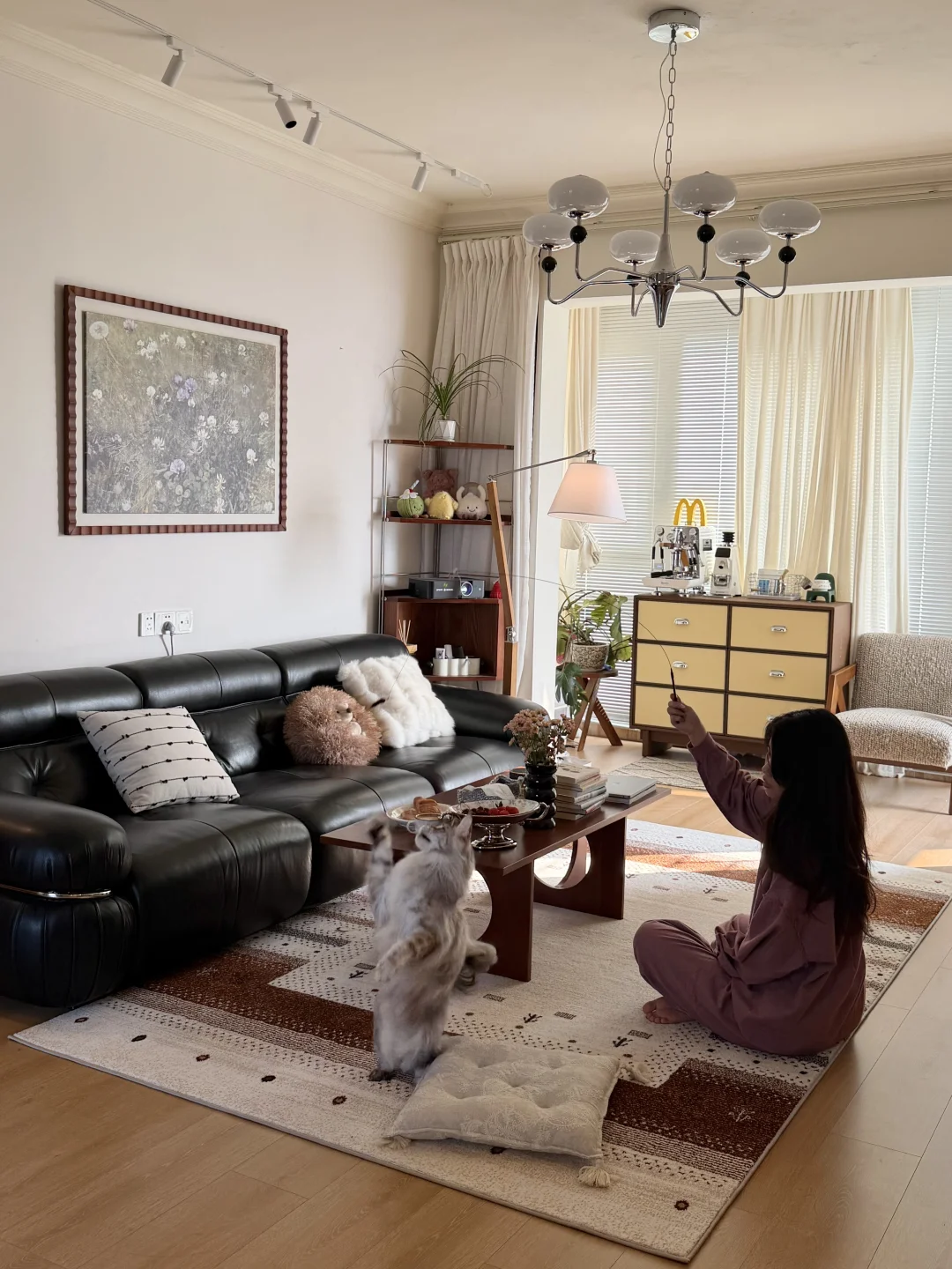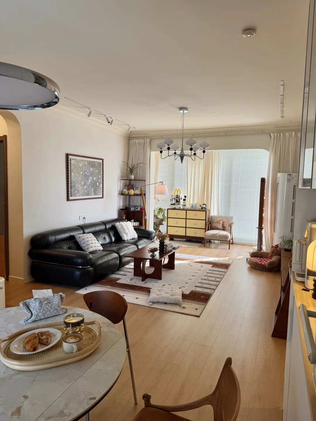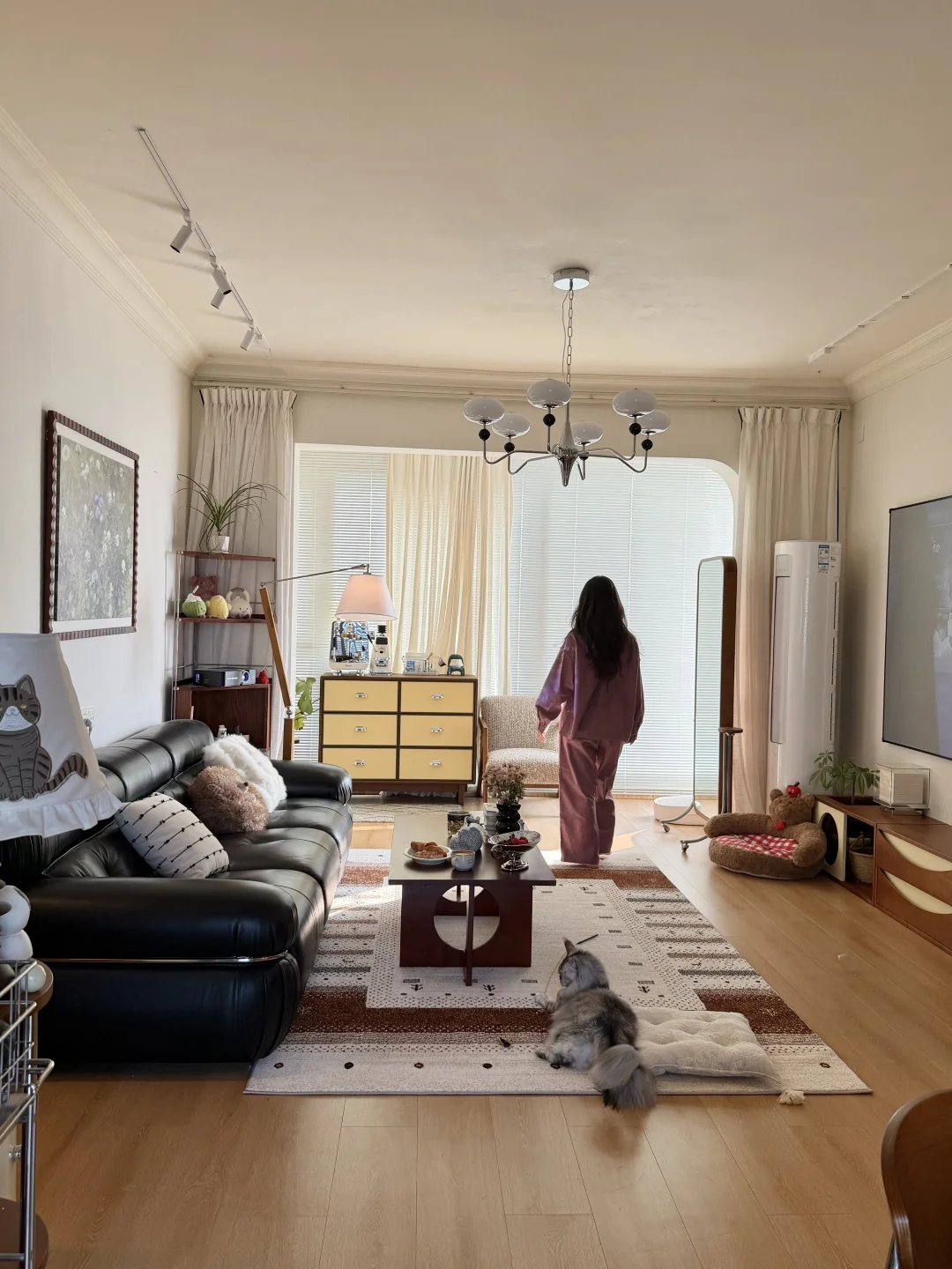 我家是精装改造成现在的样子。 硬装没改,后期封窗,阳光是可以直接洒进客厅,暖洋洋的。 整体基调都是简单暖白色,家具都是实木黑白棕色调。 整体是温馨的中古风~很耐看