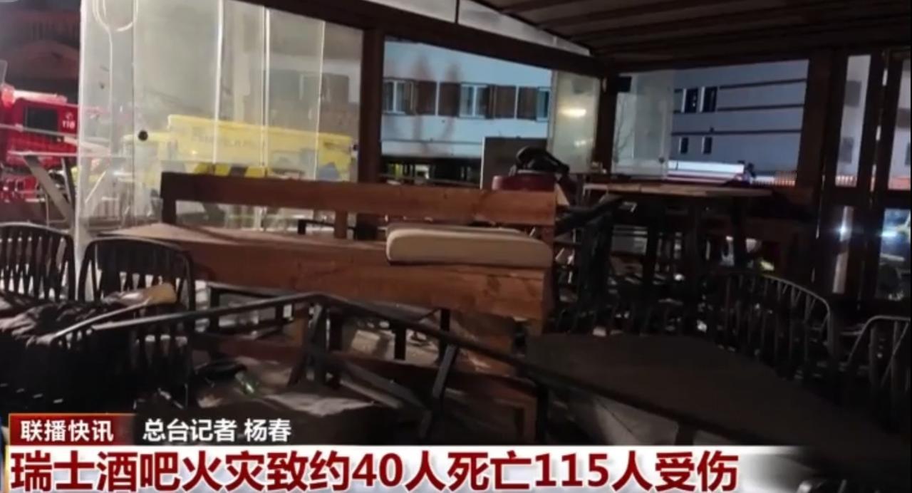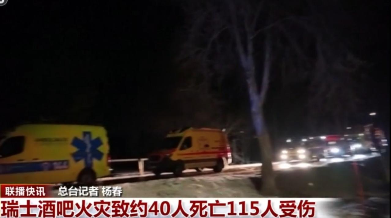 瑞士一处酒吧发生严重火灾事故,已造成约40人死亡、115人受伤。画面中能看到事故现场停靠着救护车、消防车等救援车辆,酒吧内部设施因火灾遭到损毁,救援工作在夜间紧张开展。此次事故伤亡惨重,当地相关部门已介入调查火灾原因,并开展后续的善后与救治工作。