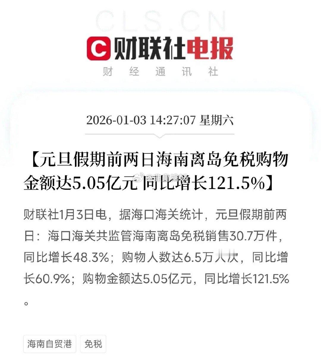 狂揽5.05亿!海南免税元旦爆单,消费升级赛道迎来明确信号2026年消费市场的第一缕曙光,从海南离岛免税市场强势迸发!元旦假期前两日,海南离岛免税购物金额飙至5.05亿元,同比激增121.5%,购物人次同步大涨60.9%。这份亮眼成绩单的背后,不仅是政策红利与节日效应的叠加,更清晰勾勒出中国消费升级的新路径,多条产业链正迎来确定性机遇。数据背后的三大趋势,揭示了消费市场的深层变革。消费力与客单价双升成为核心亮点,121.5%的销售额增速远超60.9%的人次增速,意味着游客不再是"浅尝辄止",而是主动追求高端精品消费。从免税店内排起长队的奢侈品柜台,到优惠后价格比官网低千元的新款iPhone 17 Pro Max,再到每克较岛外便宜120元的黄金饰品,高端消费意愿的强劲释放,印证了国内消费市场的韧性与潜力。免税+度假的磁力持续增强,封关政策落地叠加离岛免税新规优化,让海南彻底成为"不出国享免税"的首选目的地,跨年夜三亚国际免税城延时营业至凌晨2点,200米长队再现"扫货热潮",彰显"购物+度假"模式已形成强大吸引力。更重要的是,作为可自由支配的高端消费,免税市场的火爆是消费信心复苏的黄金信号,为2026年消费市场注入了强劲动能。这场消费盛宴中,多条产业链正同步受益,迎来发展新契机。免税运营商龙头稳居C位,中国中免凭借全渠道免税资质、超80%的海南市场占有率,以及与1600个国际品牌的直签资源,成为最大赢家。其旗下三亚国际免税城作为国家AAAA级旅游景区,贡献了三亚超九成的免税销售额,"首店首发+独家限定+互动体验"的创新模式,持续将流量转化为消费力。资本市场已敏锐捕捉到这一信号,龙头企业的业绩预期有望随高频数据持续上调。旅游零售全产业链联动复苏,免税消费的火爆形成强大辐射效应。航空业率先受益,2025年12月18日至2026年1月3日,国内前往海南的机票预订量超72万张,境外航班预订量更是激增82%;酒店业同步回暖,三亚五星级酒店元旦预订率达八成,部分奢华别墅房价突破10万元/晚,自驾游热度飙升96%,餐饮、本地交通等配套产业也迎来客流红利。多元消费品类与品牌共享增长,消费升级方向清晰可见。电子数码、美妆护肤、奢品黄金三大品类成为核心驱动力,iPhone、华为等数码产品优惠幅度达700-2140元,香奈儿、兰蔻等美妆单品价格仅为专柜6-7折,周大福黄金饰品凭借免税政策便宜8%-12%,路易威登、香奈儿等奢侈品牌销售额占比超45%。同时,政策扩容后的扫地机器人、微型无人机等新增品类,以及花西子、大疆等国潮品牌,也在免税渠道崭露头角,丰富了消费选择。商业地产与渠道运营价值凸显,中国中免布局的"免税+有税"多元业态,以及三亚国际免税城三期等街区型购物场景建设,正在重塑高端消费载体。市内免税店的"线下体验+机场提货"模式,更将服务范围拓展至本地消费群体,形成全场景消费生态,让渠道价值持续提升。5.05亿的销售额,不仅是一组亮眼数据,更是中国消费市场潜力的集中爆发。海南封关政策的持续红利、免税品类的不断扩容、消费场景的创新升级,正共同推动"购物+文旅"生态的成熟。2026年的消费主线已从这里启航,无论是免税龙头、旅游配套,还是高端品牌与国潮势力,都将在这场消费升级浪潮中迎来更多机遇。随着春节假期的临近,海南消费热潮有望持续升温,为全年消费增长奠定坚实基础。
