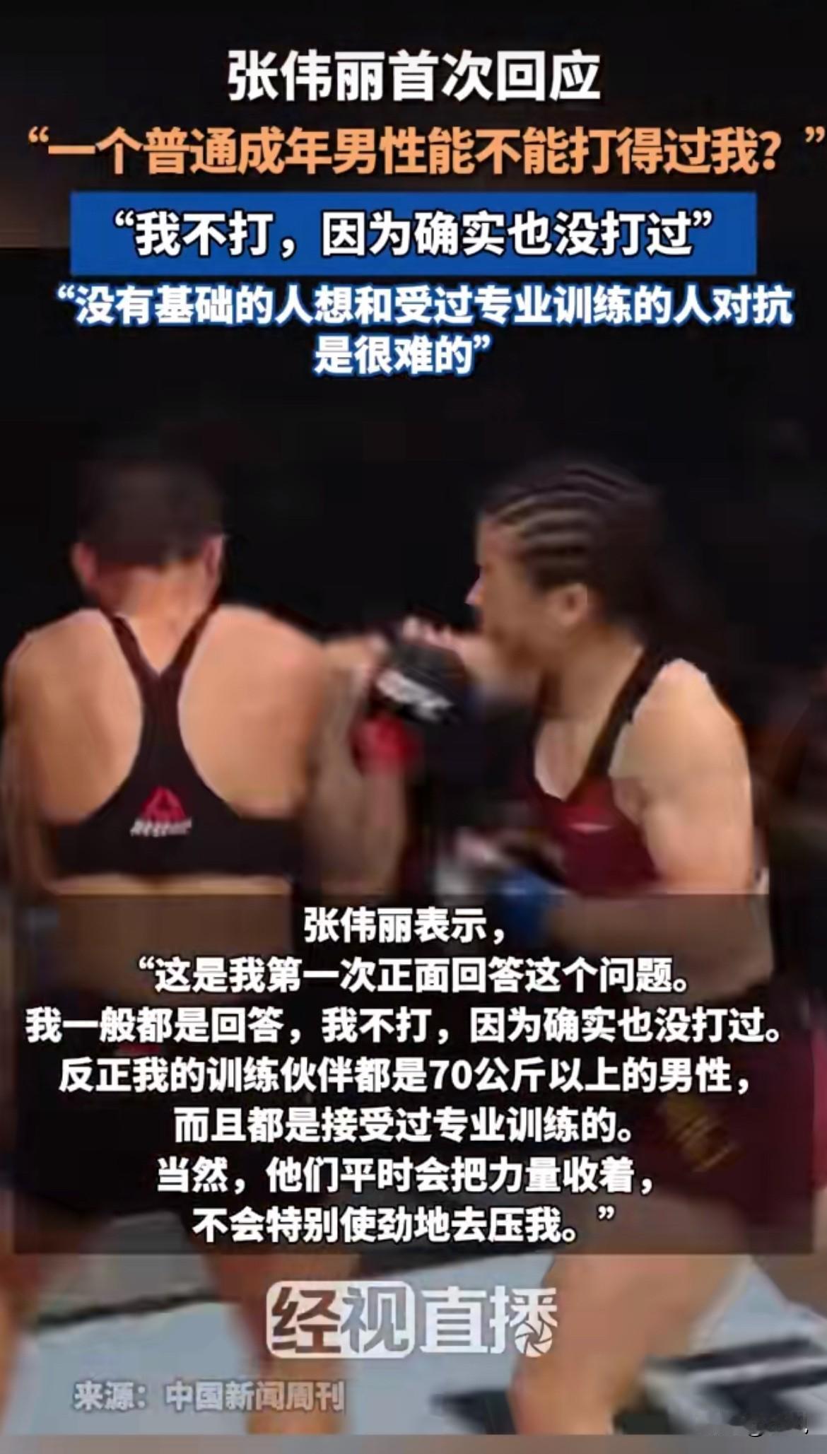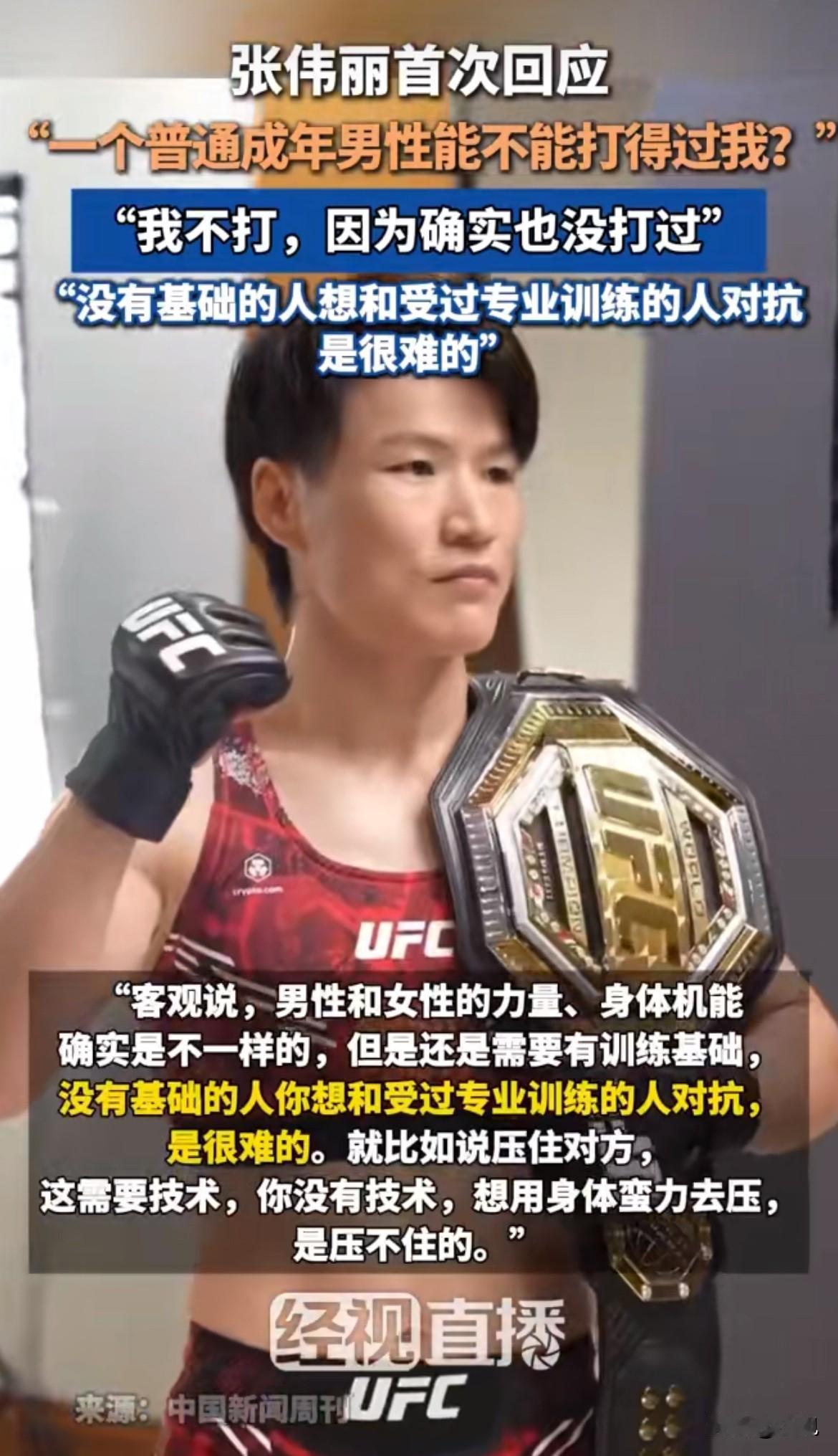 张伟丽终于不再回避那个老生常谈的问题——普通男人能打过她吗?她的回答可能让很多人清醒。 她在最近一次采访里说了大实话。网上不是总有人争论,一个普通成年男性能不能打赢这位世界顶级女拳王吗?这次她正面接了招。 张伟丽说,她所有训练伙伴,体重全在70公斤以上,都是专业男选手。这些人每天陪她对练,但人家都收着劲儿,不会真下狠手去压她。 她点出了一个关键,男女在力量和身体机能上,客观就是不一样。但更关键的是,你得有训练基础。没练过的人,想跟专业选手对抗,太难了。 她举了个很具体的例子:就说“压住对方”这个动作,那是个技术活。你没技术,光想靠身体蛮力去压,根本压不住,对方一拧一滑就脱身了。 这话说白了,就是外行想象里的“打架”,和专业格斗世界里的“对抗”,完全是两码事。普通人挥王八拳的那点力气和反应,在系统训练形成的技术、距离感和发力方式面前,几乎无效。 很多人可能不服,觉得“我就是力气大”、“我体重占优势”。但在擂台那种环境下,你的力气可能根本用不出来,你的体重可能只会让你更笨拙、消耗更快。专业训练练的不只是肌肉,更是怎么高效使用身体,怎么在对抗中思考。 张伟丽这个回应,其实轻轻戳破了一个流行已久的幻想泡泡。这个问题的背后,有时隐藏着一种对专业力量的无知,甚至是一丝不那么礼貌的轻视。觉得性别优势可以轻易抹平成千上万个小时地狱式训练带来的差距。 她的态度挺有意思,没生气也没较真,就是笑着把事实摊开:看,我的日常训练环境就是这样的,你们自己掂量。这种回应比任何激烈的反驳都有力量。 现实就是,顶级职业运动员的身体能力、反应速度和抗打击能力,是另一个维度的东西。普通人爬几层楼都喘,他们能高强度对抗多个回合。这种差距,不是靠勇气或假设就能弥补的。 所以,这个问题真的可以歇歇了。答案从来就很清楚,只是很多人不愿意相信。张伟丽用最平和的方式,给这场网络嘴炮画上了一个句号。讨论结束,都散了吧。