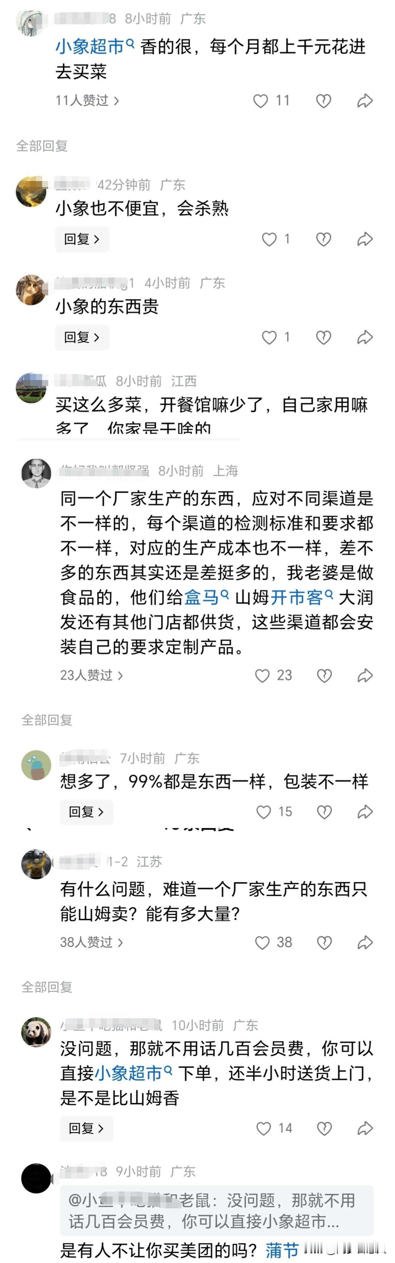 路过市场发现十来个穿印有小象超市的人,在那拿着传单,邀请路过的人注册,说是下单后半个小时就能送达,只要买够30元就可以送3-4样东西! 随口问了一下,才知道原来是之前的美团优选在广东关门后,美团自己整出了个小象超市,下单比优选更快送达! 我没有注册,因为他要我去应用商店下载,我嫌麻烦就不弄了。 晚上出门,看到他们还在小区以前提货点,邀请他人下载,马路上也有穿绿色的小象超市骑手在送货。 看来以后生鲜配送,估计就是小象超市一家独大了,看网上有些网友评论很划算,一些商品与山姆是同一个商家供应的。
