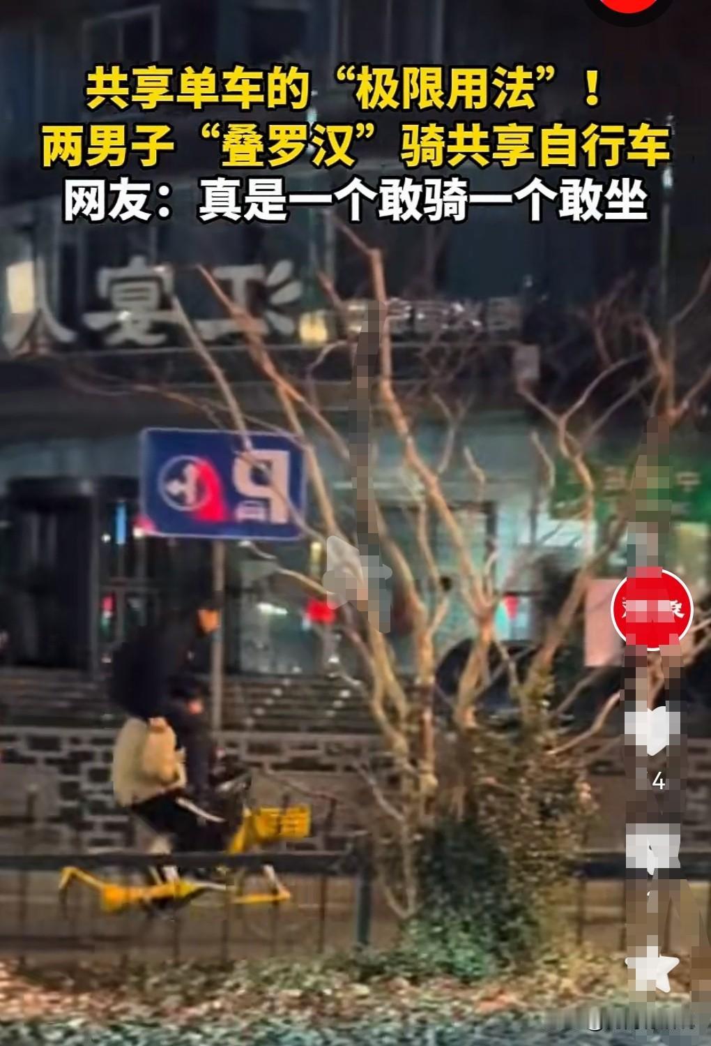 这是两个“人才”,竟然做出这么危险的举动。 1月3日(发布),江苏南京。 这真是一个敢骑一个敢坐。 两男子“叠罗汉”骑共享单车,一个人竟然是坐在驾驶者的脖子上的。 这真的是太危险了。 真得好好教育一下这两个人,要罚款才行。