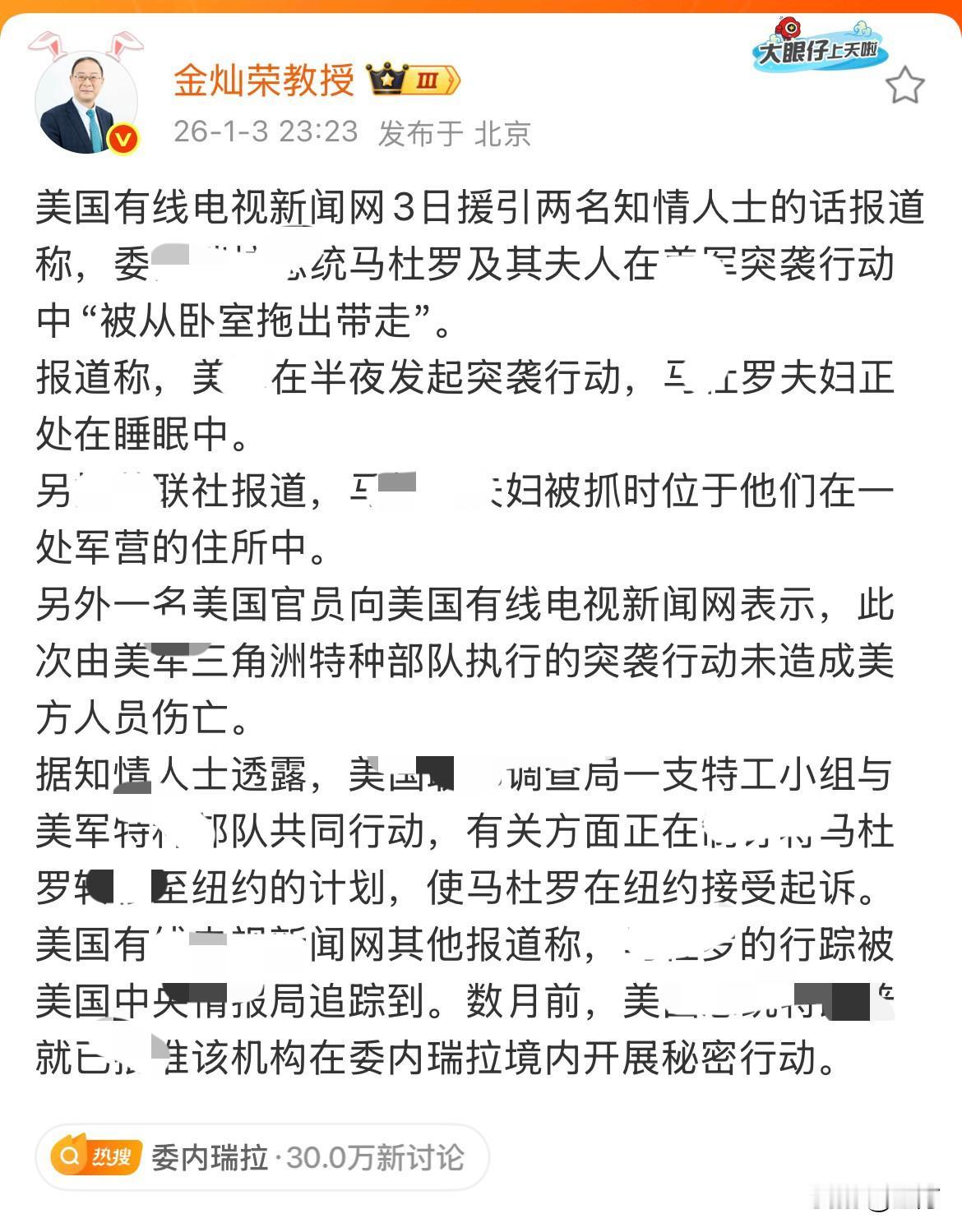 金灿荣教授:这两口子现在睡觉,被从卧室拖出带走! 今天晚上,灿荣教授汇集了这件事情最新消息,没想到他两口子,居然在这个时候还能够睡得着觉! 从方方面面的消息来看,他应该是知道对方打过来了,因为他在当天傍晚的时候就宣布进入了紧急状态,可是半夜就被捉了,而被捉的时候,他们两个人还在卧室里面,确实有点不符合常规的逻辑。 因为对方又没有采取特别先进的武器,按照道理来说,他们任何方面的力量,都是能够拦住这些个人的,当然,有一种特殊的情况,那就是后面这一段。 对方在很久之前就掌握了他们的很多信息,估计多多少少会有点里外接应 ,不然不会做得如此的丝滑,被保护的程度一定是比较高的。 对方能够如此丝滑的,在一个多小时就拿下,这中间发生的事情应该不是咱们想象的那样互相激烈的火拼,反而应该是他们两口子学校的人完全就没有反应过来,这种可能性相对来说大一些。