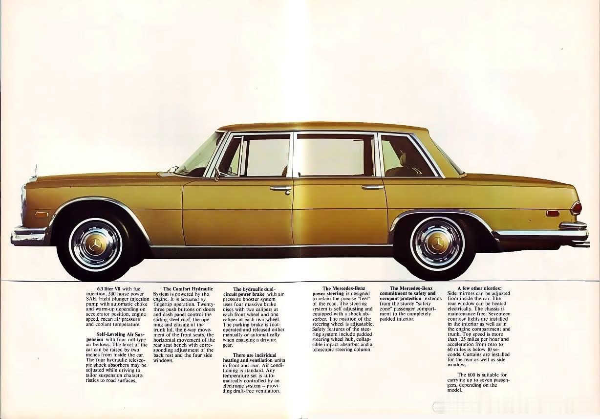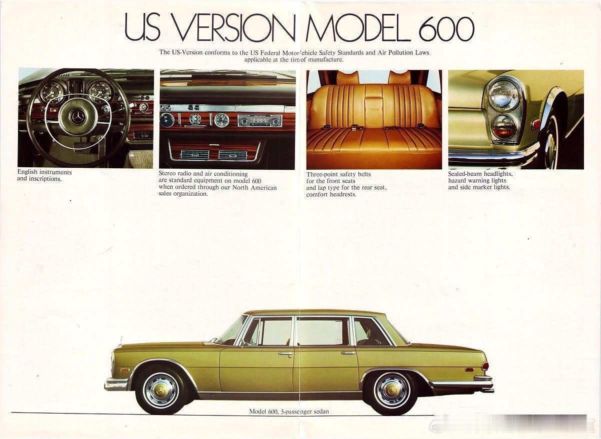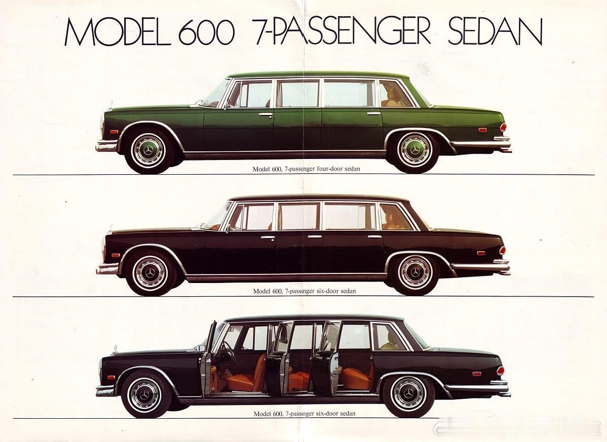 奔驰Model 600(代号W100,1963-1981),奔驰最顶级超豪华旗舰,人称“大帝奔驰”,专供给王室元首/顶级富豪,这是奔驰最值得收藏的车型一、 车型核心历史(1963-1981)1. 研发背景:1955年立项,奔驰不计成本研发,目标超越劳斯莱斯,打造“汽车工业巅峰之作”,耗时8年落地2. 首发亮相:1963年法兰克福车展首发,Paul Bracq操刀设计,惊艳全球,定义超豪华礼宾车标杆3. 车型分类:分2类4款,全系手工打造◦ 短轴版(3.2米轴距):四门硬顶,日常通勤用,产量2190台◦ 长轴版(3.9米轴距):Pullman四门硬顶(304台)、Pullman六门硬顶(124台)、Landaulet敞篷礼宾版(59台,最稀有)4. 核心配置:6.3L V8(后期7.3L V8),匹配全球首款液压自动变速箱;全车液压系统(转向/刹车/门窗/座椅),当年顶级豪华配置5. 停产与产量:18年累计仅生产2677台,1981年停产,无直接继任者,地位后由迈巴赫接替。 它是奔驰超豪华旗舰的巅峰标杆打破劳斯莱斯垄断,是全球首款将大排量V8+全液压控制系统量产的超豪华车,手工工艺、用料奢华度(真皮/胡桃木/定制内饰),至今仍是奔驰豪华天花板,被誉为“移动的宫殿”。6.3L V8是当时量产最大排量民用车发动机,7.3L V8版本更是性能天花板,平顺性无车能及。2677台总产量,敞篷Landaulet仅59台,如今精品车况拍卖价超千万欧元,是经典车收藏界的顶流。奔驰S级历史 上世纪60年代末期,中国曾进口过5辆奔驰600,其中包括1辆标准轴距和4辆600 Pullman,全部用作外交座驾使用。