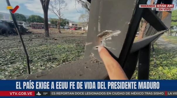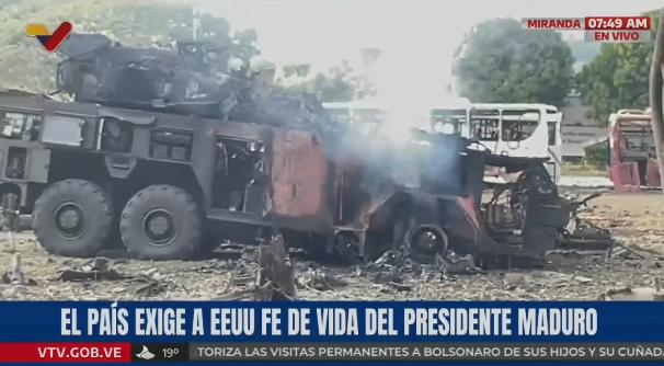 美军袭击的加拉加斯米兰达空军基地的视频截图 有正在冒烟的坦克,还有路边被击毁的多辆公交车,被损毁的门窗,建筑围栏,路灯等。万幸的是,袭击发生在凌晨,倘若是白天时间,公交车可能会有很多人,那就丧尽天良了。