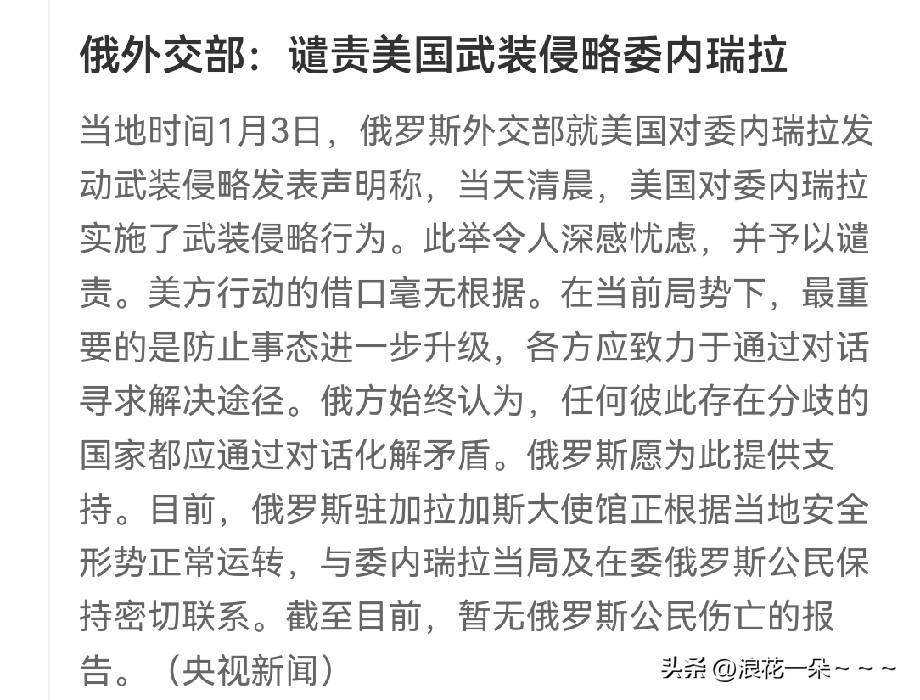快讯!快讯! 就在刚刚,俄罗斯外交部发声了——强烈谴责美国武装侵略委内瑞拉! 唉!怎么说呢?俄罗斯情报技术也是不错的,同时,俄罗斯跟委内瑞拉关系也还是可以的。美国突然偷袭委内瑞拉,也不是一时心血来潮说打就打的,应该是前面好长时间计划好,有露出端倪的,毕竟,美国此前已经多次放话要对委内瑞拉实施打击。 难道打击之前俄罗斯一点情报信息也没掌握吗?如果掌握一点,电话一打通知一下委内瑞拉总统马杜罗,那还能会被美三角洲特种部队当场抓获吗? 现在,虽然俄罗斯对美国进行谴责了,态度虽然很好,但是,能把马杜罗及夫人救回来吗?现在都不知道被美国带到哪里去了?俗话说:活要见人、死要见尸嘛?[捂脸]