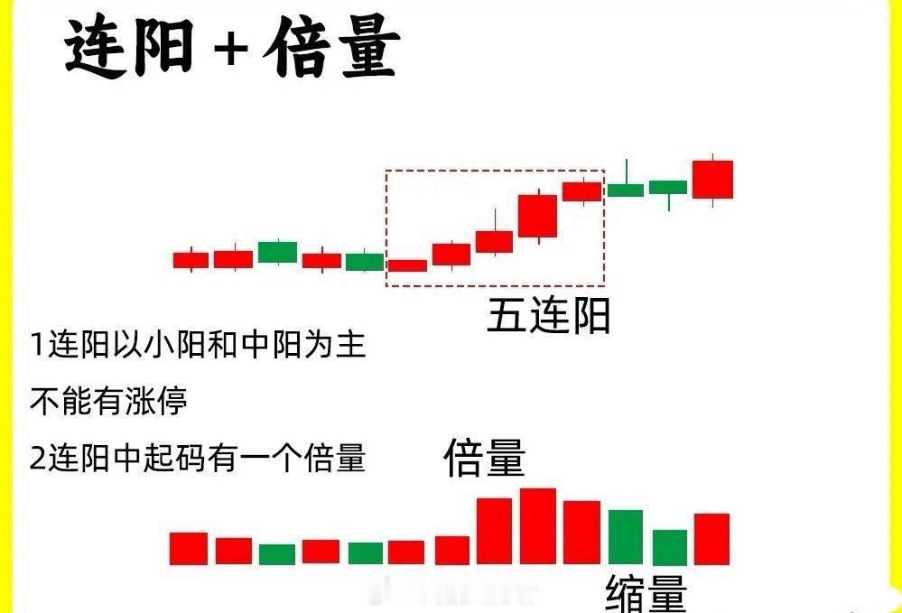 大家注意了!主力拉升前往往会留下一个关键信号——连阳加倍量。要是你还没吃透这种形态背后的主力逻辑,那这段内容可得仔细看。连阳加倍量是很明确的主力痕迹,意味着多方力量正在悄悄积蓄,是个值得关注的积极信号。具体来看,这种形态有两个核心特征:股价在底部区域出现连续阳线,至少两根以上,通常是从小阳线慢慢过渡到中阳线、大阳线,底部不断抬高,中间不会夹杂阴线或十字星,呈现出阳包阳的强势走势。成交量则要出现“倍量”,也就是当天成交量比前一天放大两倍以上,而且在连阳过程中,成交量会阶梯式递增,后量超前量,形成量价同步走强的态势,这背后正是多方力量持续增强的体现。像九九艳阳天、六连阳这些都是常见的连阳形态。下面给大家准备了案例图,建议把这些形态记熟,吃透这个基础知识点,才能更好地捕捉主力动向哦。