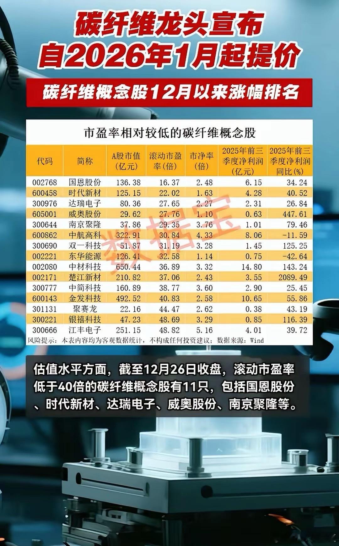 2026年1月全球碳纤维涨价,国内涉及碳纤维的上市公司不多,名单如下:仅供参考,不做投资依据。涉及碳纤维材料的A股股上市公司有:国恩股份、时代新材、达瑞电子、威奥股份、南京聚龙、光威复材、中航高科、双一科技、东华能源、中材科技、楚江新材、中简科技、中复神鹰、金化科技、聚赛龙、银禧科技、江丰电子等。