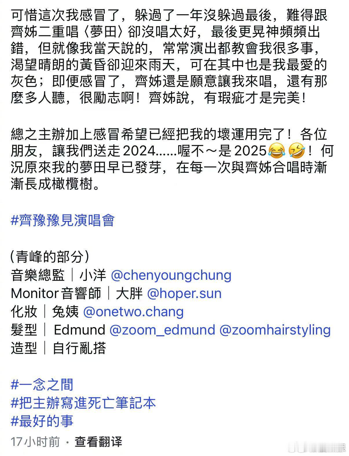 吴青峰说被齐豫演唱会主办方威胁“把主办方写进生死薄✍️”笑死我了