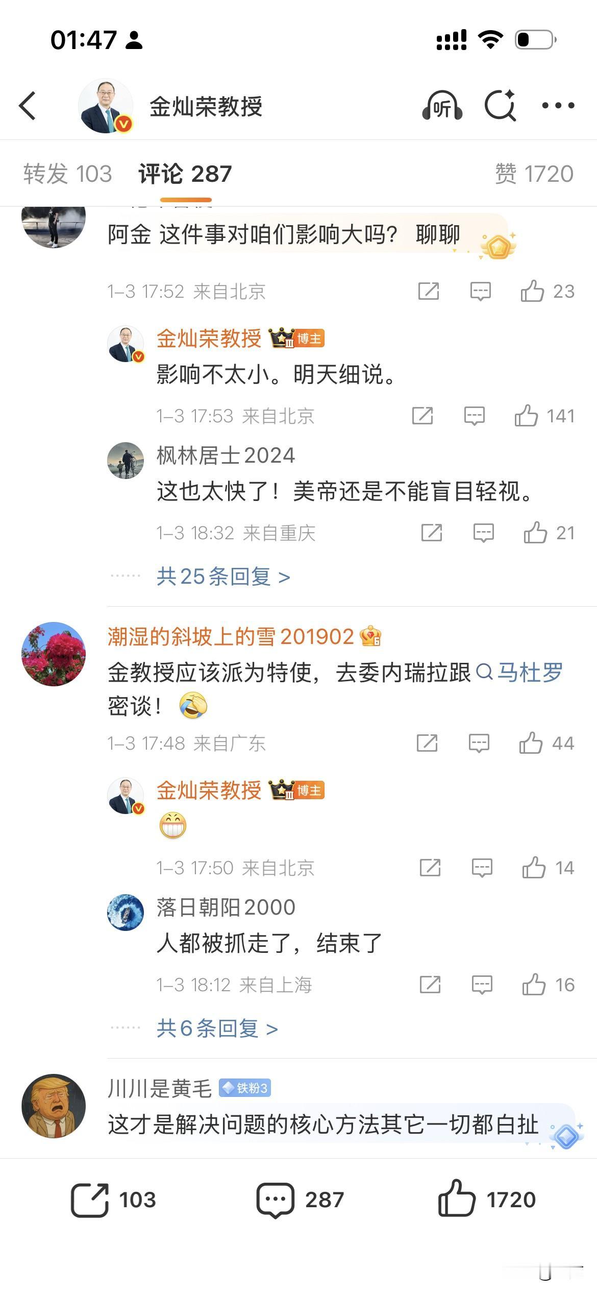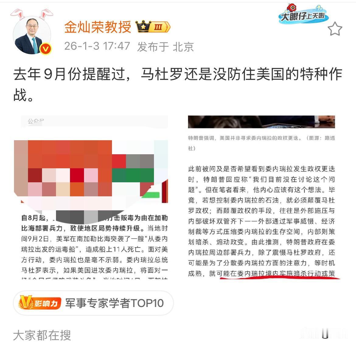 金灿荣教授:去年9月份提醒过,马杜罗还是没防住美国的特种作战! 今天晚上 金灿荣教授对这个事情做了分析,他自己其实在去年九月份的时候就专门写过一篇文章,当时就让小马要注意,一定要把自己的安全放在头一位。 没想到金教授的这个提醒仅仅过去了一个季度的时间,小马就被老头抓起来了! 但是大家现在更加感兴趣的,不是小马本人,而是小马他现在被抓了之后,对我们的影响有多少? 本以为不关我们什么事情,没想到金灿荣教授说,对我们的影响不是很小,他说的非常的保守,也就是说这个事情多多少少对我们还是有一点点影响的。 但具体是什么情况,以及老头对小马接下来的处置可能会影响到方方面面,金灿荣教授表示,要在今天晚一点的时候,专门为这个事情,出个节目,把能够存在的可能性都抛出来给大家看看,到时候给大家做一个全面的分析。
