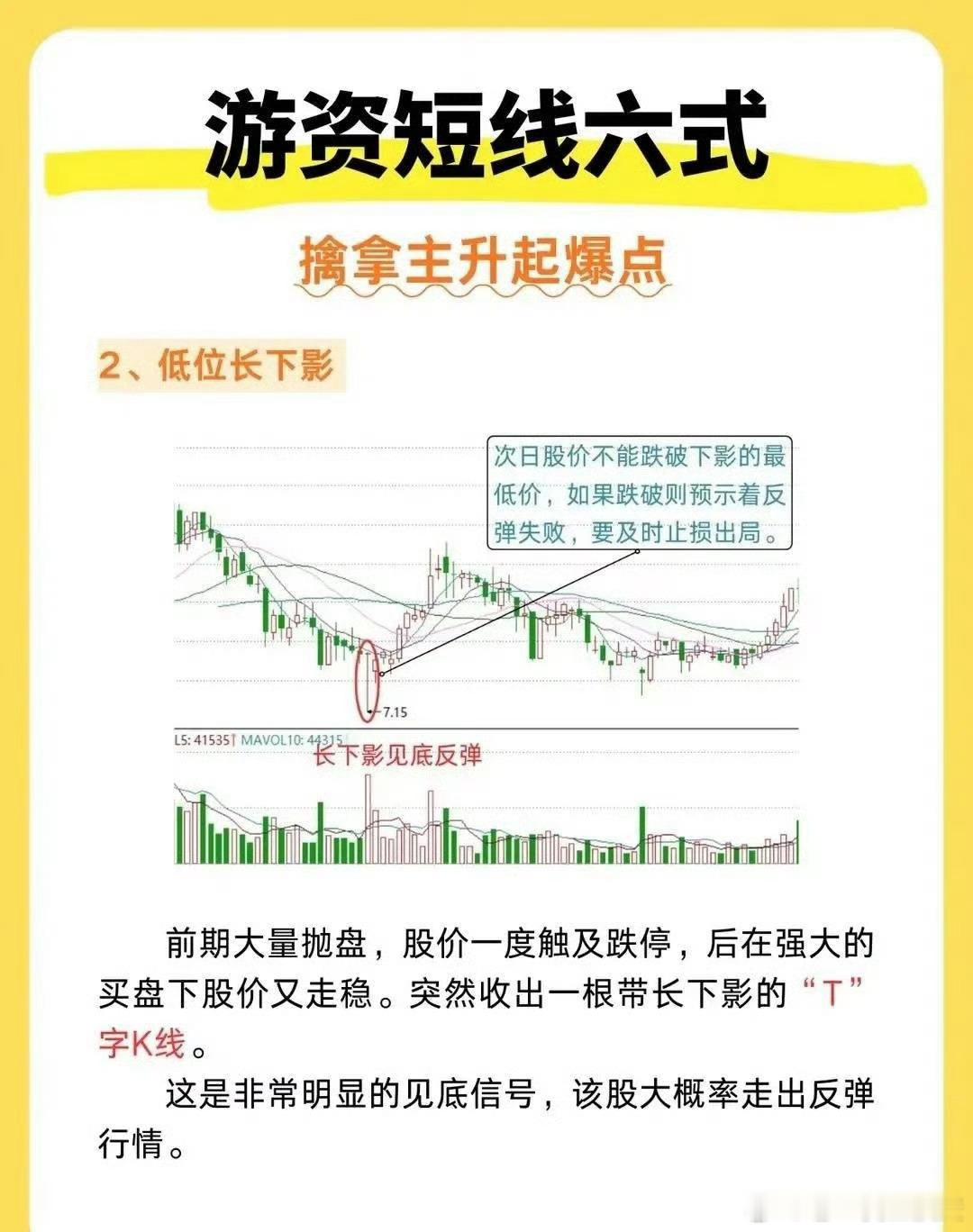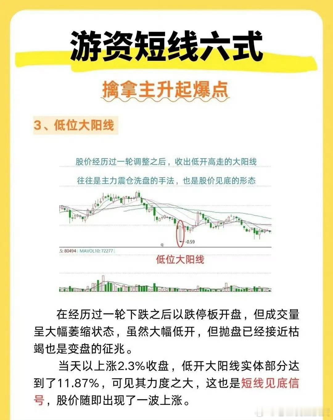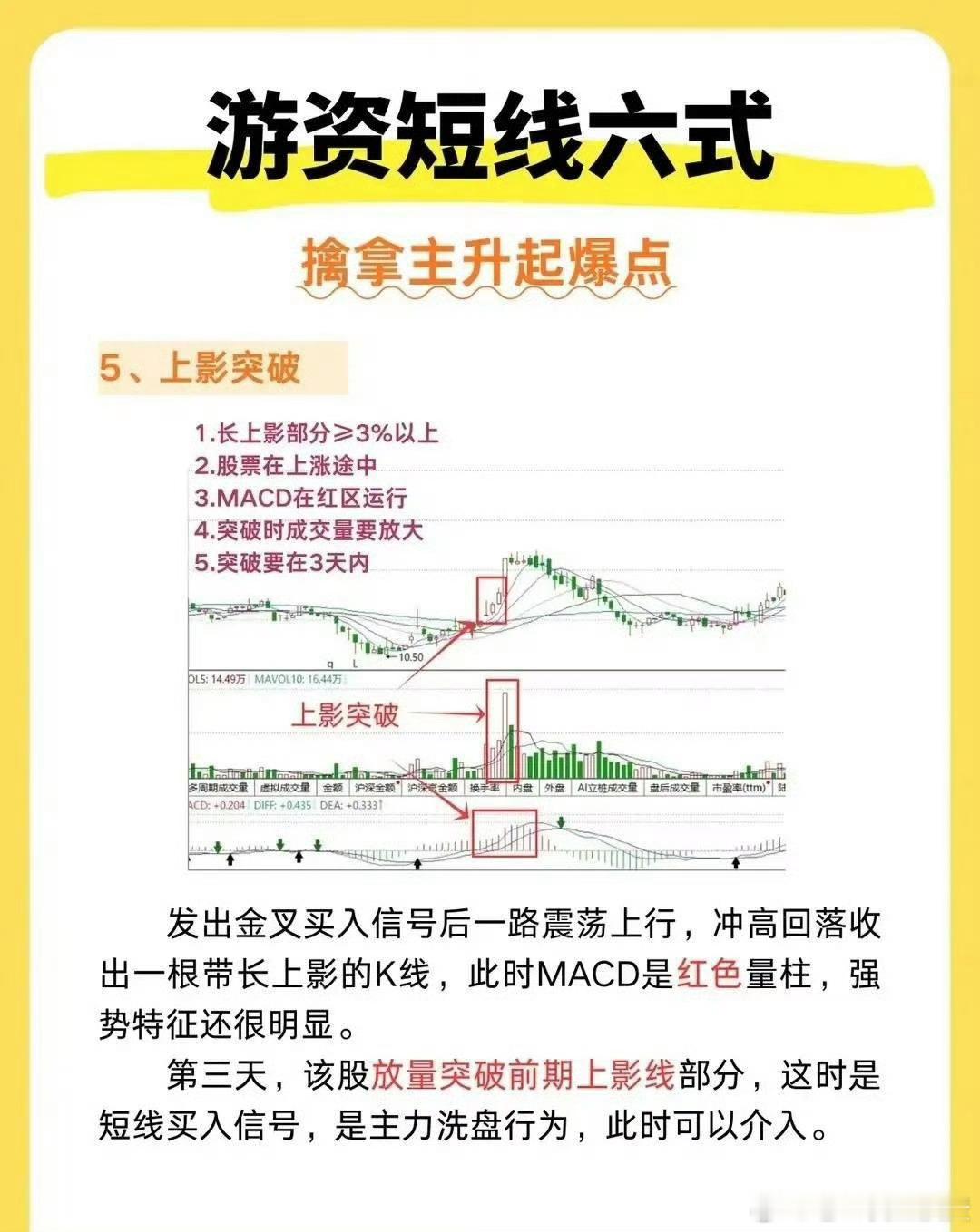 “游资短线六式——擒拿主升起爆点”:游资短线六式——擒拿主升起爆点 是一套针对短线操作的技法,主要通过识别特定的 K 线形态、成交量变化以及 MACD 指标配合,在主力拉升前的起爆点及时介入,从而捕捉快速上涨的机会。六式分别是:1. 双针探底在底部波浪式上涨过程中,出现两个相近的低点,并且都在同一价位受到强力支撑,收出长下影 K 线。股价不破前低,说明主力在护盘,是潜在的起爆信号。2. 低位长下影在低位出现长下影 “T” 字 K 线,表明抛压衰竭、买盘强劲,是典型的见底信号。关键条件是次日股价不能跌破长下影的最低价,否则反弹失败需及时止损。3. 低位大阳线股价经过调整后收出低开高走的大阳线,多为震仓洗盘后的见底形态。若低开但成交量萎缩、实体涨幅较大(例如超过 10%),短线见底概率高,随后容易出现上涨。4. 横盘突破横盘时间越短(最好不超过 7 个交易日)说明主力做多意愿越强。连续横盘整理、成交量萎缩、MACD 在红区运行时,放量突破横盘高点并涨停,是短线买入信号,容易出现暴涨。5. 上影突破条件包括:长上影部分不小于 3%、股价处于上涨途中、MACD 在红区运行、突破时成交量放大、突破发生在 3 天内。上涨途中收长上影 K 线后,若放量突破上影高点,多为洗盘结束信号,可短线介入。6. MACD 梅开二度第一次 MACD 金叉后股价小幅上涨,随后紫线拐头向下、红柱缩短、成交量萎缩;当紫线再次拐头向上、红柱重新变长、成交量放大时,形成“梅开二度”,是明确的买入信号。整体核心思路:这六种形态都围绕 底部或上升途中的特定 K 线组合 + 成交量变化 + MACD 指标配合 来判断主力洗盘结束或护盘迹象,在起爆点及时介入,追求短线快速上涨。关键在于形态的确认与信号的同步验证,避免单一条件误判。