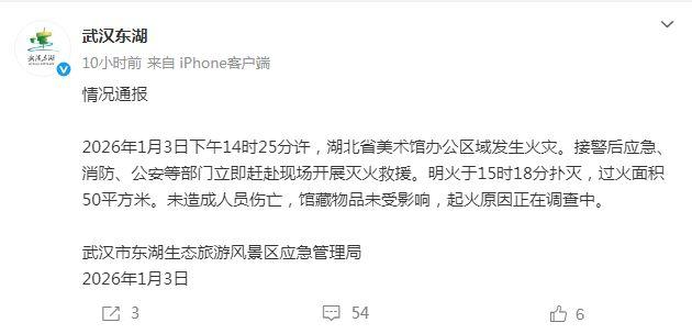 自从南京博物院的书画藏品文物《江南春》流出到拍卖市场后,很多网友当时就说现在所有博物馆都要注意防火,消防部门要重点检查博物馆的消防安全。 网友们是非常有经验的,或者说网友们看过太多用火灾事故来销账的故事,过去这样的例子也不仅仅出现在影视剧里,例如一些管理财务张本的房子发生火灾,现实中也是有不少这样的案例,而且现实可能比影视剧还更精彩。 1月3日下午,有网友在网上发文爆料,湖北美术馆突然失火了。很快就有不少网友陆续发了湖北美术馆火灾的照片,一时间让众多网友们惊呆了,大家惊讶的不是失火的事情,而是怎么这么快发生了网友们预料到的事情。 不过很快武汉东湖区官方就发布了情况通报,证实湖北省美术馆确实发生了火灾,在办公区域起火的,过火面积50平方米,一个小时左右就扑灭了明火,火灾没有造成人员伤亡,馆藏物品也没有受到火灾影响。 我认为湖北美术馆火灾的事情完全是一个巧合的事情,湖北美术馆和其他博物馆不太一样,这个里面更多都是现代艺术藏品,而非历史文物藏品,和那些历史文博馆是有很大的区别,所以网友们也不要有过多的联想。