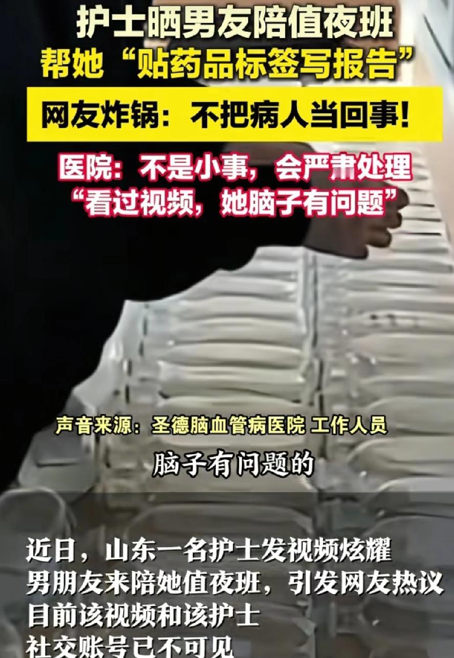女护士值班秀恩爱,一句“我的夜班搭子”透露出她是个“惯犯”。 男友配药贴标签,写报告这波熟悉的流程操作可以看出,他对女友当助理已经不是第一次了。 值班室随意摆放的私人物品,透露出护士把医院当家的的常态。 作为医护人员,她是否明白她的工作的特殊性,医院用一句“她脑子有问题”诠释了她的行为有多离谱,这不仅是网友和患者不能接受,更是让同行都惊讶的问题。