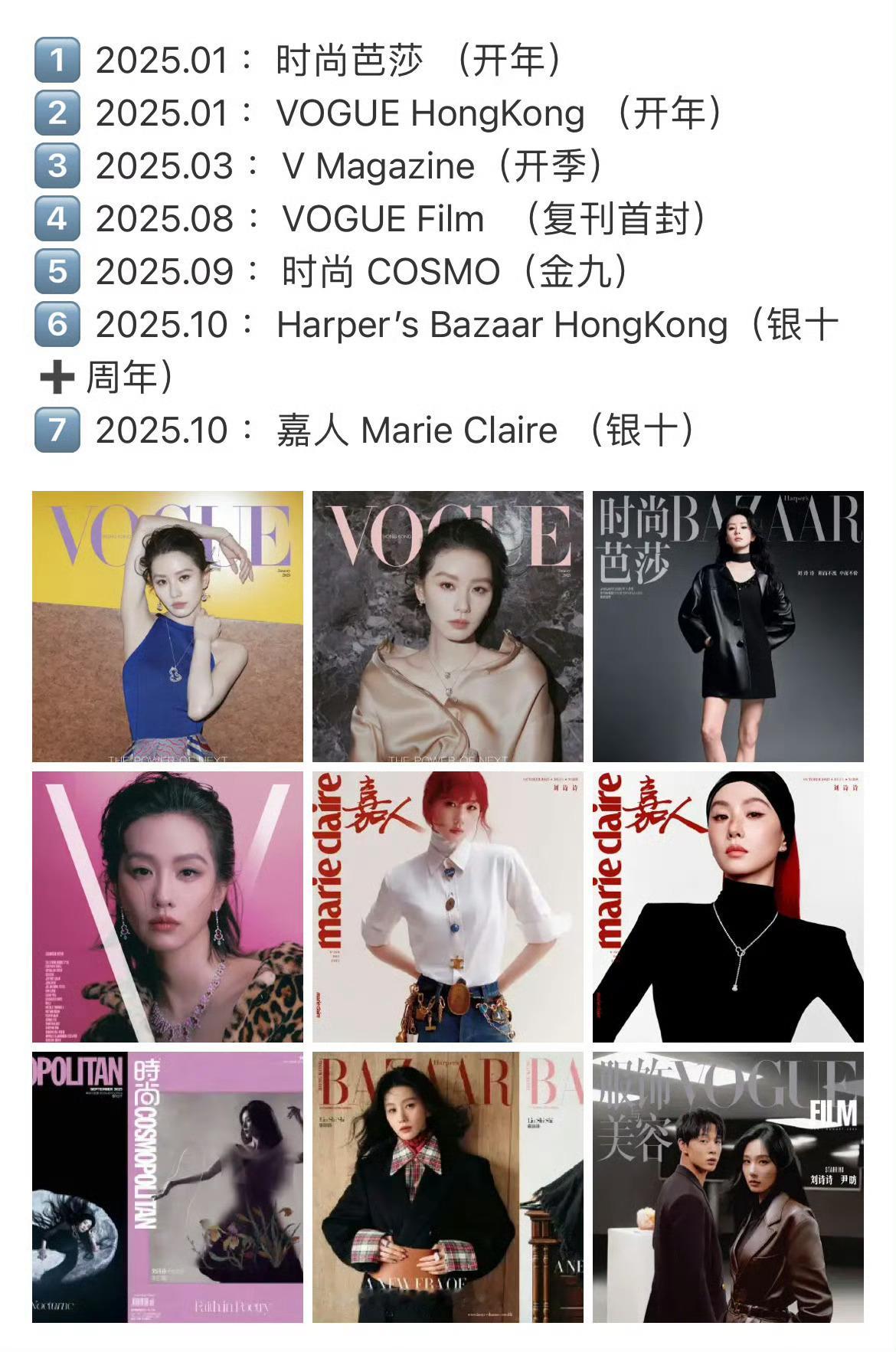 华人女星(大花➕85花➕90花)内地主流女刊刊数排行榜,其中刘诗诗五大女刊25刊,主流女刊41刊,刘诗诗2025年主流女刊,年内重要月份大满贯,金九银十开季周年开年➕Og➕撞刊,战绩85花top,时尚杂志质量更上一层楼 ,期待2026年更多精彩 !