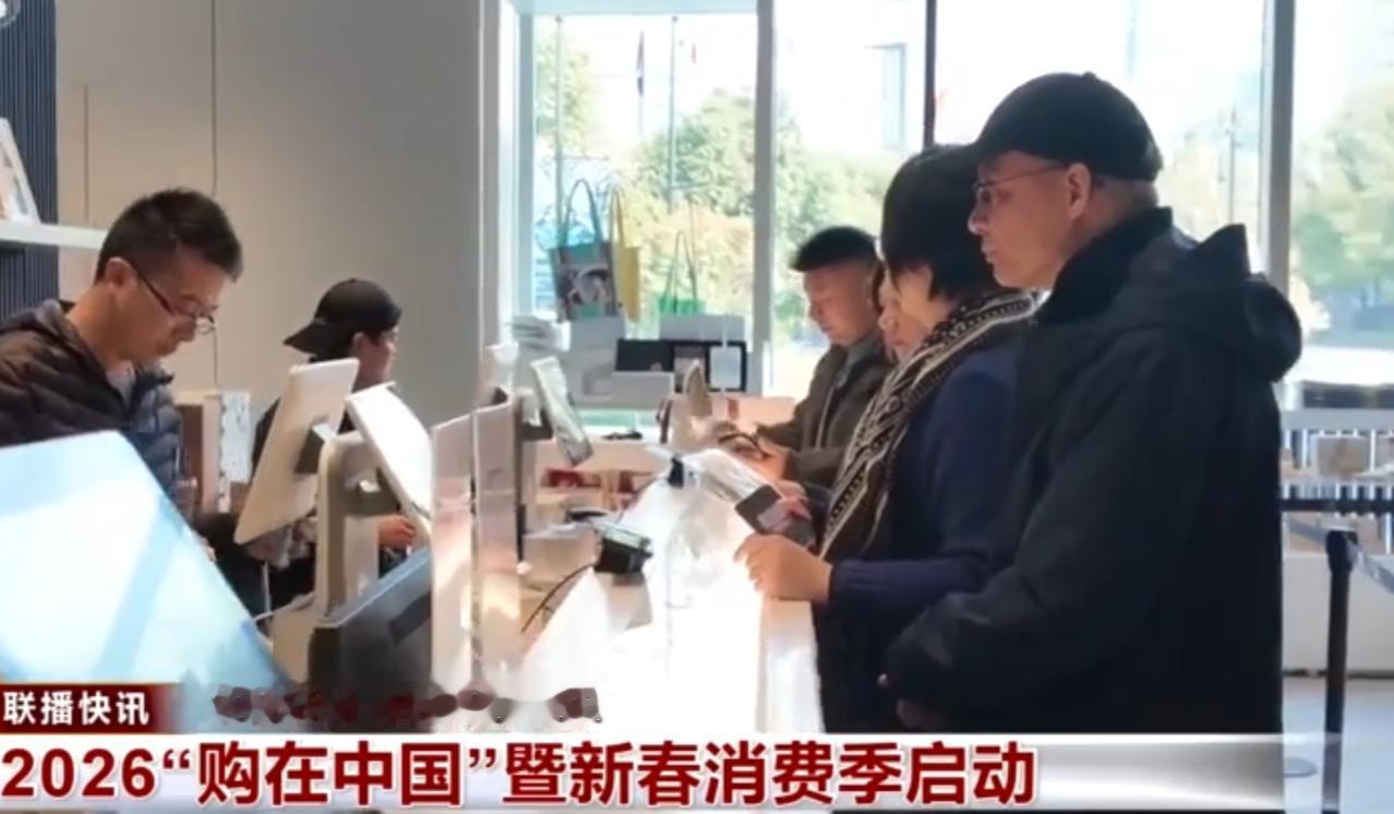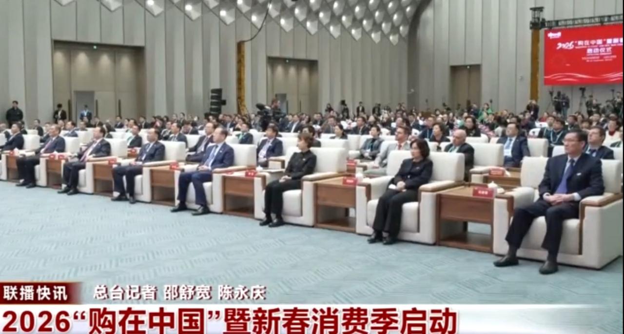 镜头先展现江豚保护工作现场,工作人员借助设备为江豚开展检测,蓝色的江豚暂养箱矗立水面,尽显生态保护的用心。画面随即切换,2026“购在中国”暨新春消费季正式启动,会场内参会人员齐聚,城市商圈人流涌动、消费场景火热,展馆中民众驻足观赏展品,勾勒出生态保护与消费市场双繁荣的生动图景。