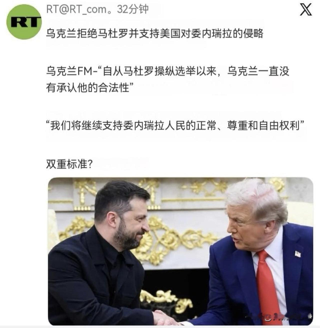 特朗普抓了马杜罗之后,乌克兰第一时间跳出来了。 乌克兰支持美国对委内瑞拉的所有侵略行动。 大家看看,是不是很荒谬呢? 一个正在遭受俄军侵略的国家,却大张旗鼓的支持美军对委内瑞拉的侵略。 乌克兰人这个逻辑很清奇啊。 当然了,他们也有洗地的办法。 乌克兰方面表示,他们从来都不承认马杜罗政权的合法性,因为马杜罗涉嫌操纵了选举。 唉呦,这个理由看似有道理,但是没想到他们自己把自己绕进去了。 乌克兰人把自己给绕进去了。 你乌克兰因为怀疑委内瑞拉的选举有问题,所以不承认人家委内瑞拉人民选出来的总统。 这是你的逻辑对不对? 那么同样的道理也可以扣在你的头上啊。 俄罗斯因为怀疑你泽连斯基的选举有问题,所以不承认乌克兰人民选出来的,泽连斯基这位总统。 请问这样的逻辑跟你的逻辑有什么区别呢? 你拿什么样的逻辑对待人家马杜罗? 俄罗斯也可以完全用来对付你泽连斯基啊! 大家看看有意思吧? 一个正在遭受侵略的国家,却摇旗呐喊支持别的国家侵略同样弱小的国家。 哈哈,有意思,真的有意思! 乌粉们怎么不跳出来说两句呢?洗地啊!
