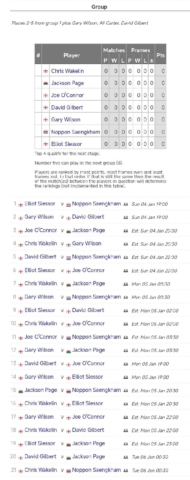 斯诺克冠军联赛第二小组赛程! 比赛从1月4日19点开始,1月6日凌晨结束,冠军晋级胜者组。 本组参赛球员包括杰克逊·佩奇、乔·奥康纳、克里斯·韦克林、埃利奥特·斯来塞、加里·威尔逊、诺鹏·桑坎姆。