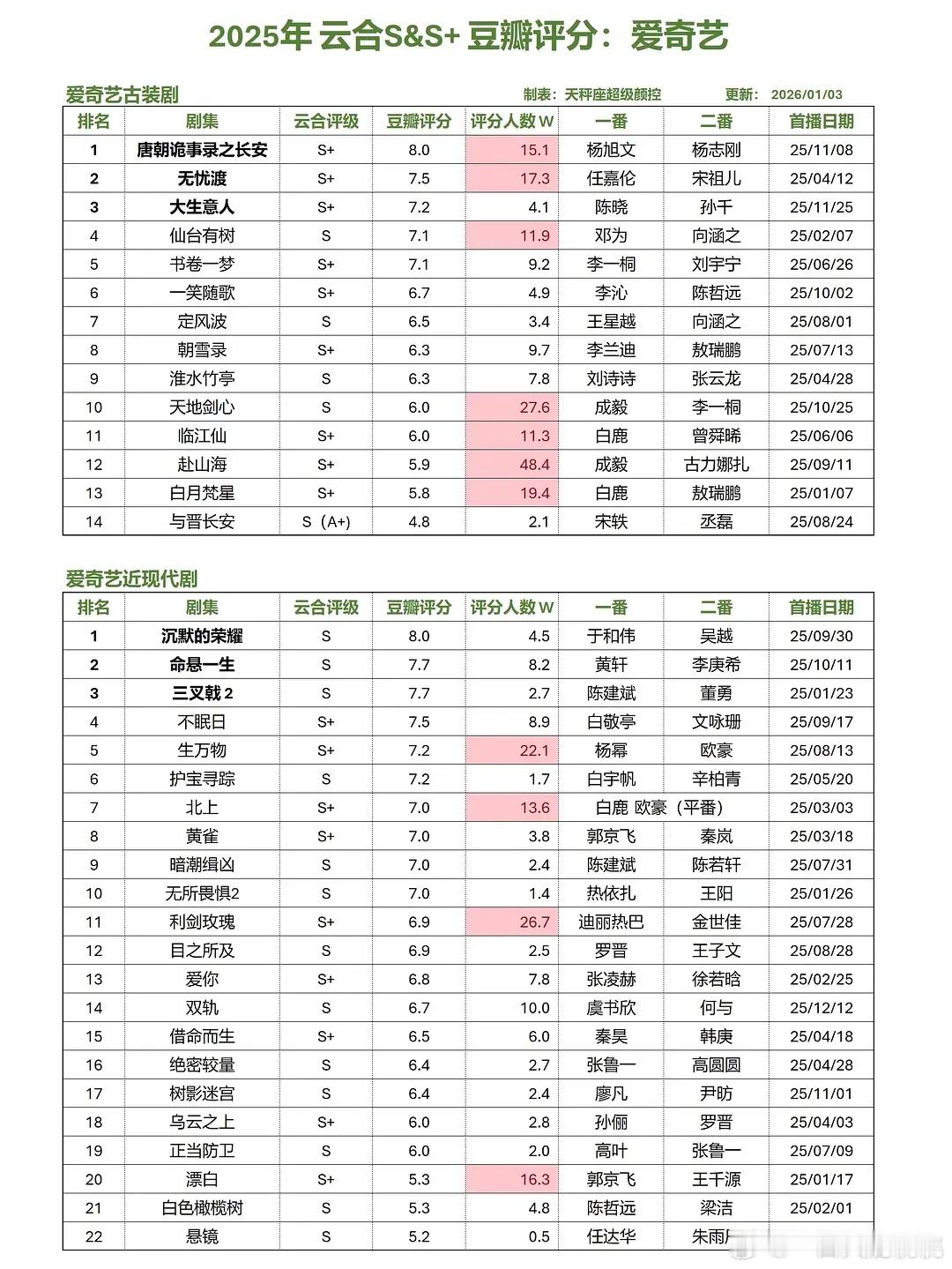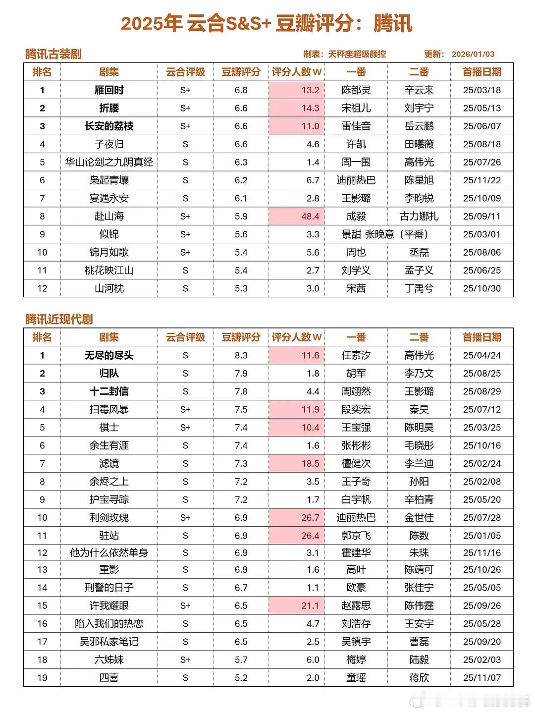 2025年三大平台S/S+剧集评分~8分以上: 👖2部(非偶),🥝2部(非偶),🐧1部(非偶)不及格: 👖4部,🥝6部,🐧7部